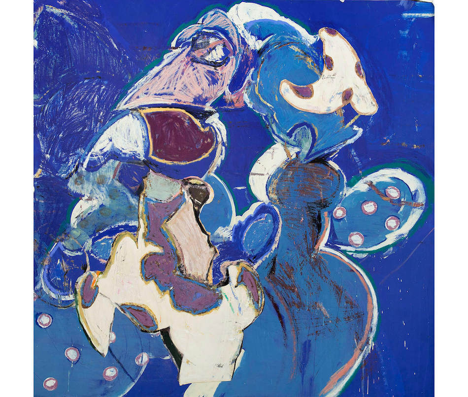 Mixing bright colours and an imagery reminiscent of cartoon drawings, the works seem to be ebbing and flowing between the worlds of pop-culture iconography and Abstract Expressionism. The violence done to the materials is evident, but so is the care and attentiveness by which these works were created. As such, Vasmoulakis’s paintings occupy a space where aggression is rendered harmless, where an encroaching danger has had its fangs and claws forcibly removed. At the same time, the works exude a sickening happiness, a triumph perhaps over nihilism with even more nihilism—as if the artist presents to us a particular way of seeing the world where the figurative is barely present not because it is concealed or abstracted, but because to paint the present is a violent and paradoxical act, if not an act of perversion.