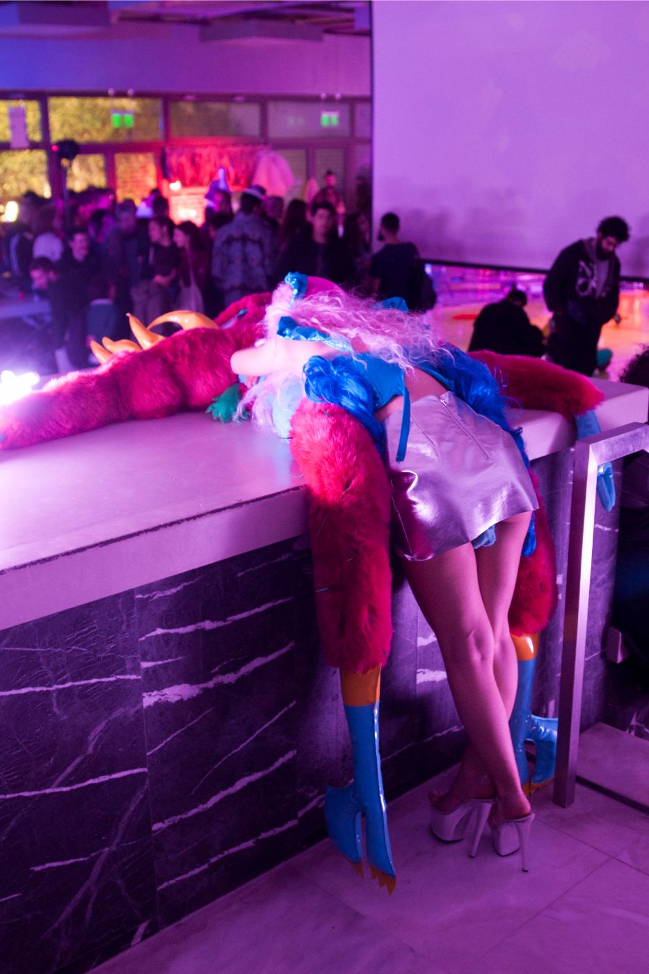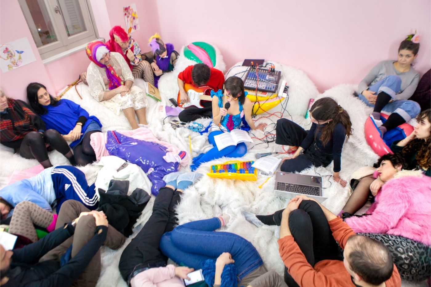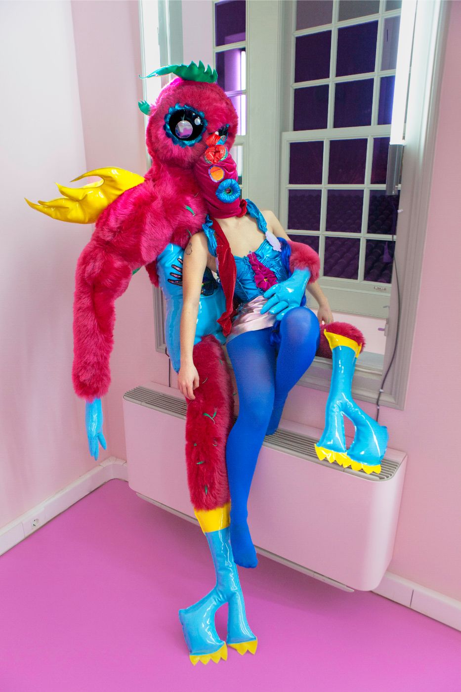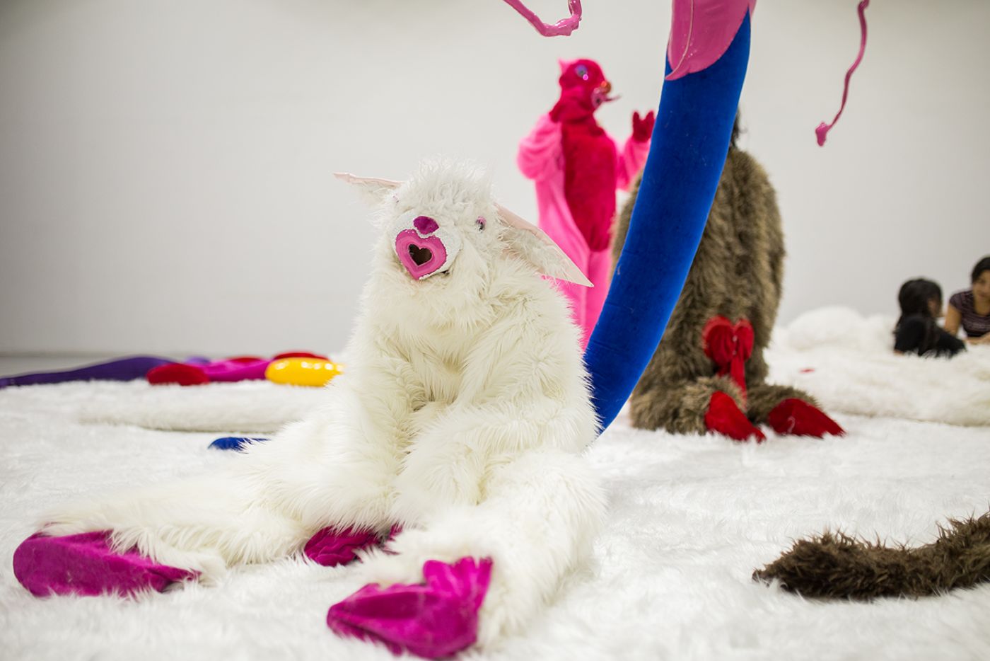 My references come mainly from my personal exploration in relation to my subjectivity, my body, my desires and my social role. Since a young age I experienced sexism and oppression due to my identity and my sexuality as a girl. I realised just how intensely political my personal experience was only later, when I began reading feminist and queer theory and discovered women artists with a strong social commentary in their works. Donna Haraway, Jack Halberstam, Virginie Despentes were my way out of a male-dominated Athens School of Fine Arts that treated my works in most cases as perversions, or [merely] colourful forms without any political context. Pipilotti Rist encouraged me to do hysterical performances and unapologetically large installations, while biologist Lynn Margulis initiated me into her symbiotic, multi-species planet. My work has always been provocative for some, but it has helped me to empower myself and feel part of a community that is connected more to the queer [community] than ASFA’s fine arts [department]. The narratives I communicate through the furry worlds I create are attempts in emancipation through collective “magic spells”.