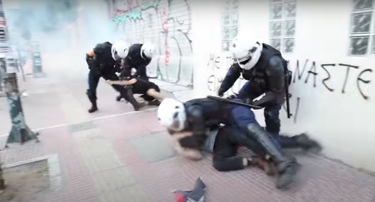 The police attacked unprovoked the antifascist group of around 600 people, as they were leaving the square and marching up Patission Avenue. In a video posted on Youtube, Titkov is randomly singled out and beaten by four policemen, at which point Lalos runs to help him and gets arrested too. According to sources, the police planted evidence on the pair after they got arrested and were charged with actions they did not commit.