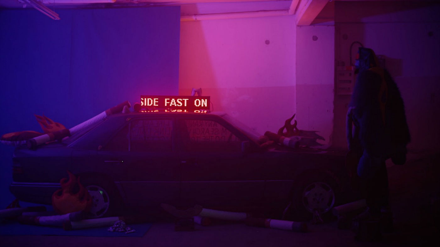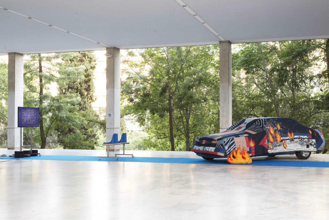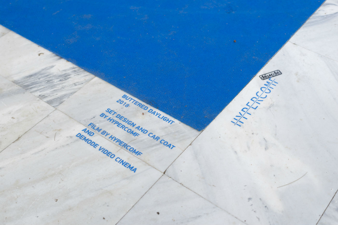 Presented in the Independent Projects section of this year’s edition of Art Athina, the installation Buttered Daylight by Hypercomf welcomed guests at the entrance to the Athens Concervatory with a rather eye-catching assortment of elements. First, there was the ultramarine carpet set against the Modernist landmark’s marble floor. Then it was the Mercedes E200 ‘92 covered with a hand-sewn hood made with reclaimed fabric from discarded clothing — a typical method for Hypecomf to make their soft sculptures and wearable objects. Next to the car, two vintage airport seats were facing a screen playing the new Hypercomf film, created in collaboration with Demode Video Cinema. Also titled Buttered Daylight, the film is a visual treat full of saturated colour, swoon-inducing photography inspired by commercial aesthetics and the deliciously humorous and emoticon-like imagery that Hypercomf is gradually becoming a master of.