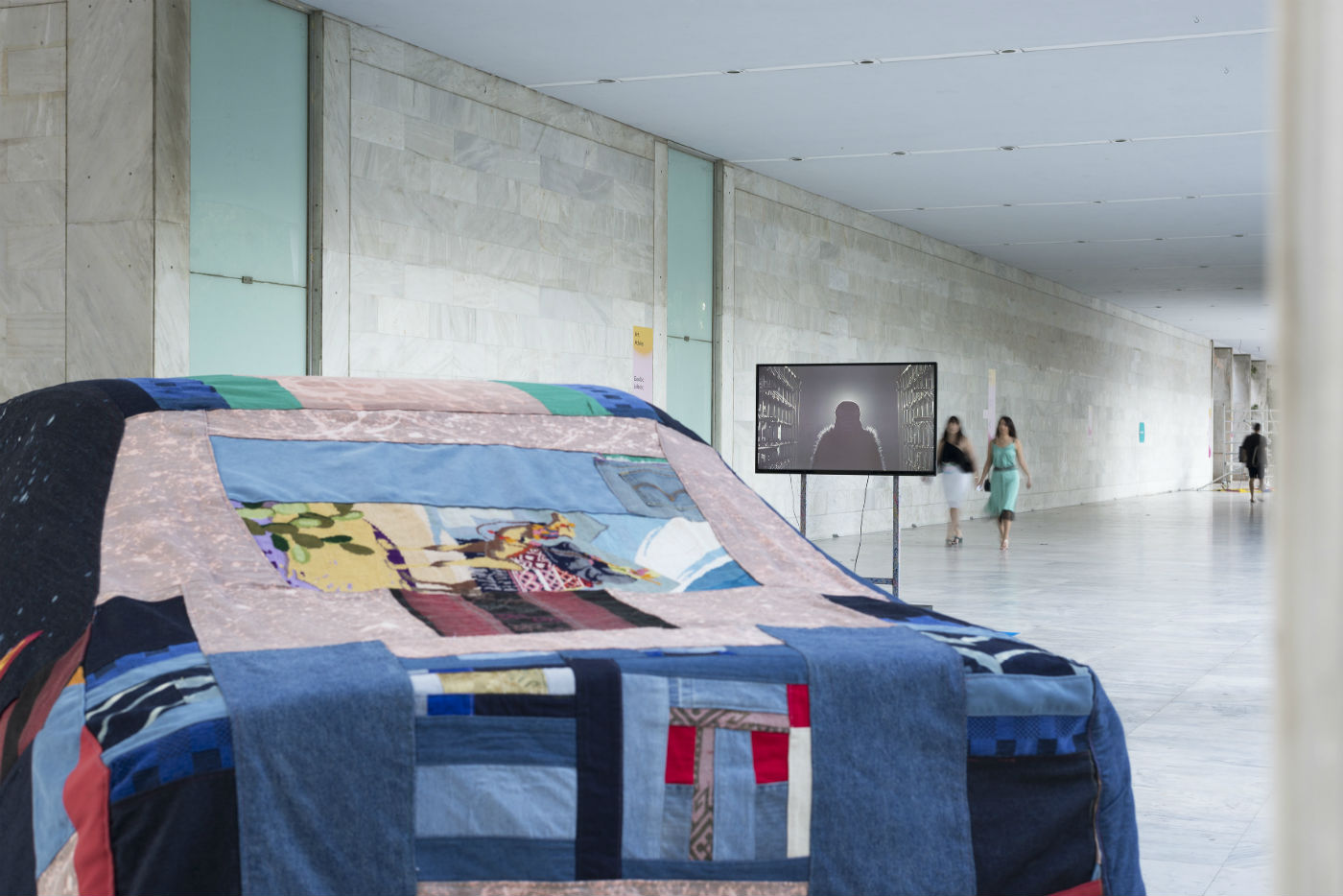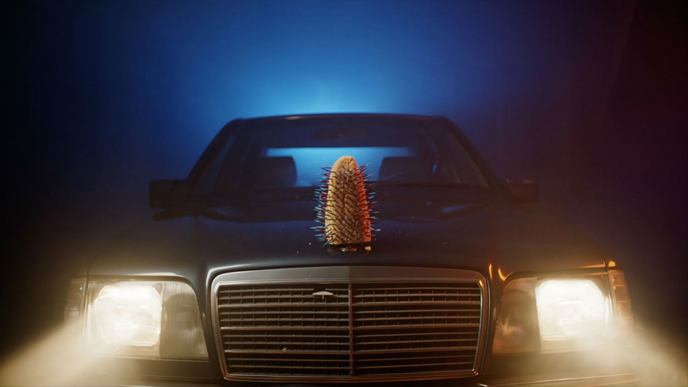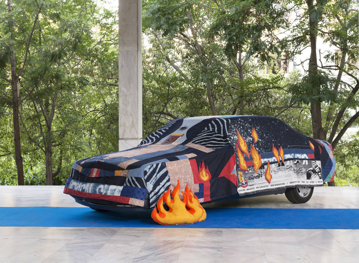 Presented in the Independent Projects section of this year’s edition of Art Athina, the installation Buttered Daylight by Hypercomf welcomed guests at the entrance to the Athens Concervatory with a rather eye-catching assortment of elements. First, there was the ultramarine carpet set against the Modernist landmark’s marble floor. Then it was the Mercedes E200 ‘92 covered with a hand-sewn hood made with reclaimed fabric from discarded clothing — a typical method for Hypecomf to make their soft sculptures and wearable objects. Next to the car, two vintage airport seats were facing a screen playing the new Hypercomf film, created in collaboration with Demode Video Cinema. Also titled Buttered Daylight, the film is a visual treat full of saturated colour, swoon-inducing photography inspired by commercial aesthetics and the deliciously humorous and emoticon-like imagery that Hypercomf is gradually becoming a master of.