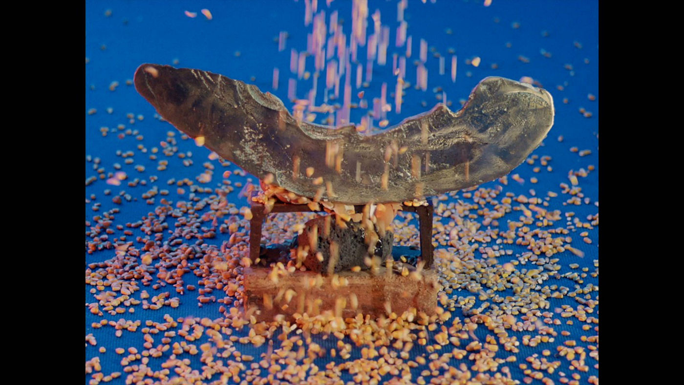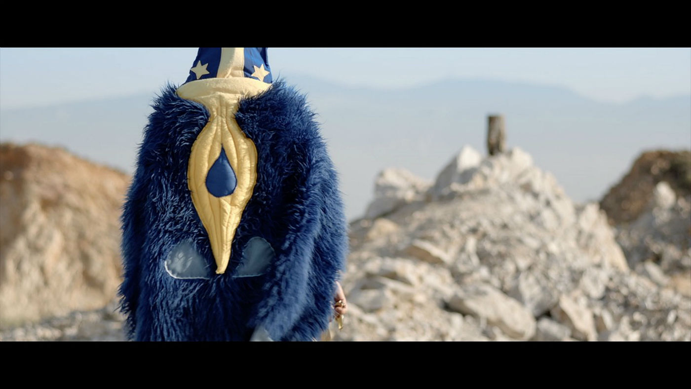 Shot at various locations in Athens, the film follows a mysterious shaman-like figure who visits a factory, a rocky wilderness and a hazy interior wearing a bright-blue furry cape decorated with various symbols. Given that Hypercomf’s work has a lot to do with capitalism, over-consumption and the excess of contemporary civilisation, the film feels that takes place in a dystopian future where machines and the debris of today’s civilisation have become the materials with which humans live a primitive life. The second part of the film is shot in a dense, technicolor fog that the artists describe as a “colourful brain fog” that magically connects human bodies with machines to create “a parallel sentient reality”.