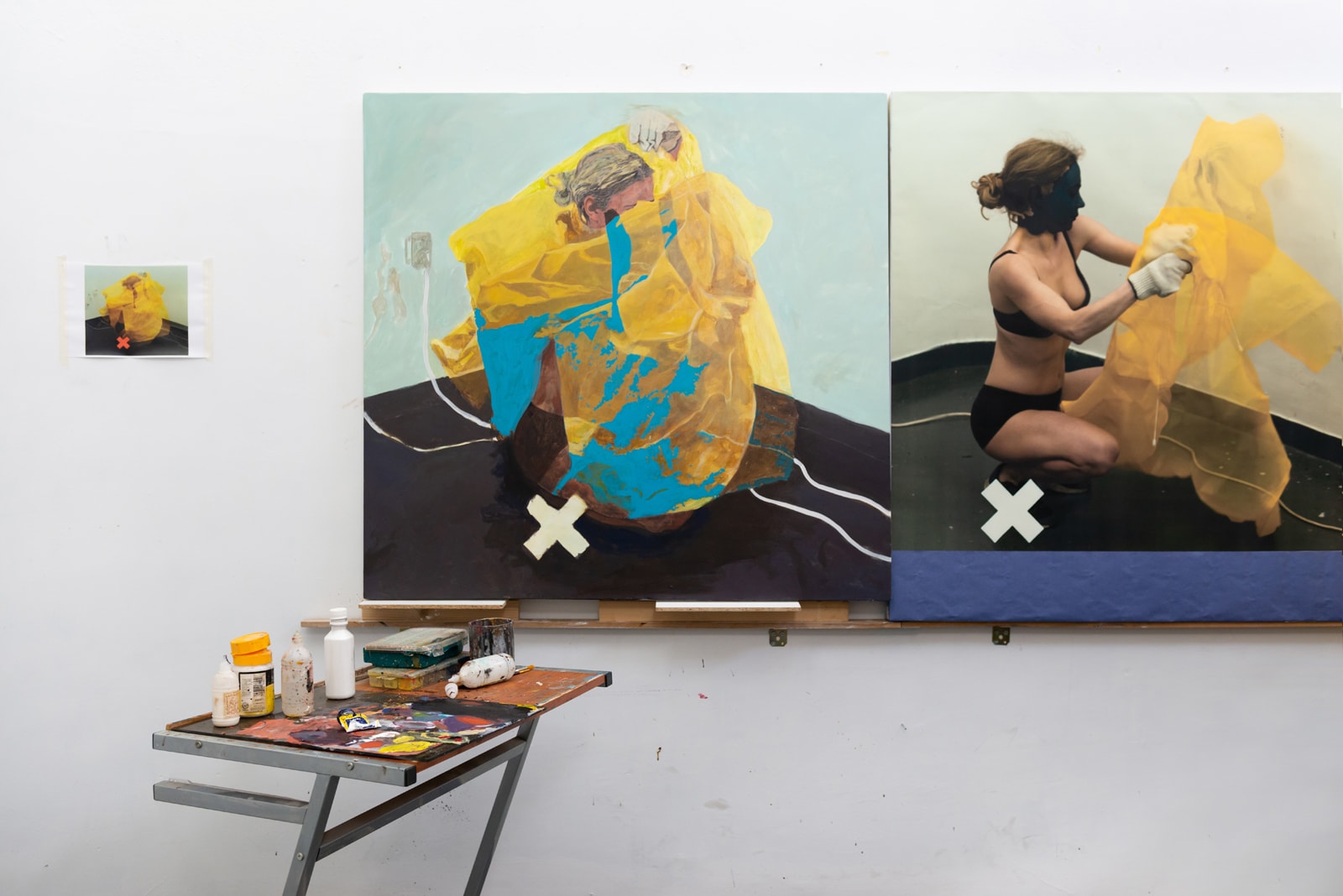 Ideas on referencing ‘’the history of art" or "other people's work" contain wider questions, like how different art forms relate to one another. In the case of images, I'm interested in the relationship between painting and photography. It's not a novel question, such comparisons have been made extensively in the past, by artists such as Duchamp or Hamilton, but it's important for me to work on this. Photography became part of my practice while staying in the UK, where I didn't have much room to paint so I turned to digital tools and manipulating photographs. I was producing images by taking photos, tweaking or heavily distorting them, and this was a painting process for me. The edited photo was the final work. Now I’m working on diptychs, on how a processed photograph can stand next to a painting based on the same photoshoot. They will be large in scale, I want to complete a few and see what comes out. This is a new page for me.