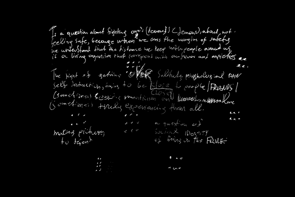 These notes have a particular significance for me. Since a very young age I had a very special communication with writing, and my contact with art began exclusively through writing: I used to write short stories, poems, novels... After a while I realised that writing was something I could do but didn’t find fulfilling. So I left it aside but without destroying my work or quitting it altogether. And that practice transformed into something that was truly my own, it’s something I do without thinking too much, without being a self-standing thing for me. Now I still write, but as scattered words, very freely, mostly as a kind of healing. So all of this practice, together with other things I would do from time to time, created a body of notes, poems etc. Later on, there was a time when I was working a lot trying to understand how my photographic work could have a sense of narrative—for things to have a connection between them, so that one could move from one image to the other. It was within that state of mind that I began reading what I used to write earlier, and realised that there were things that had a connection with my current work, and that they helped me get across what I want to say better.