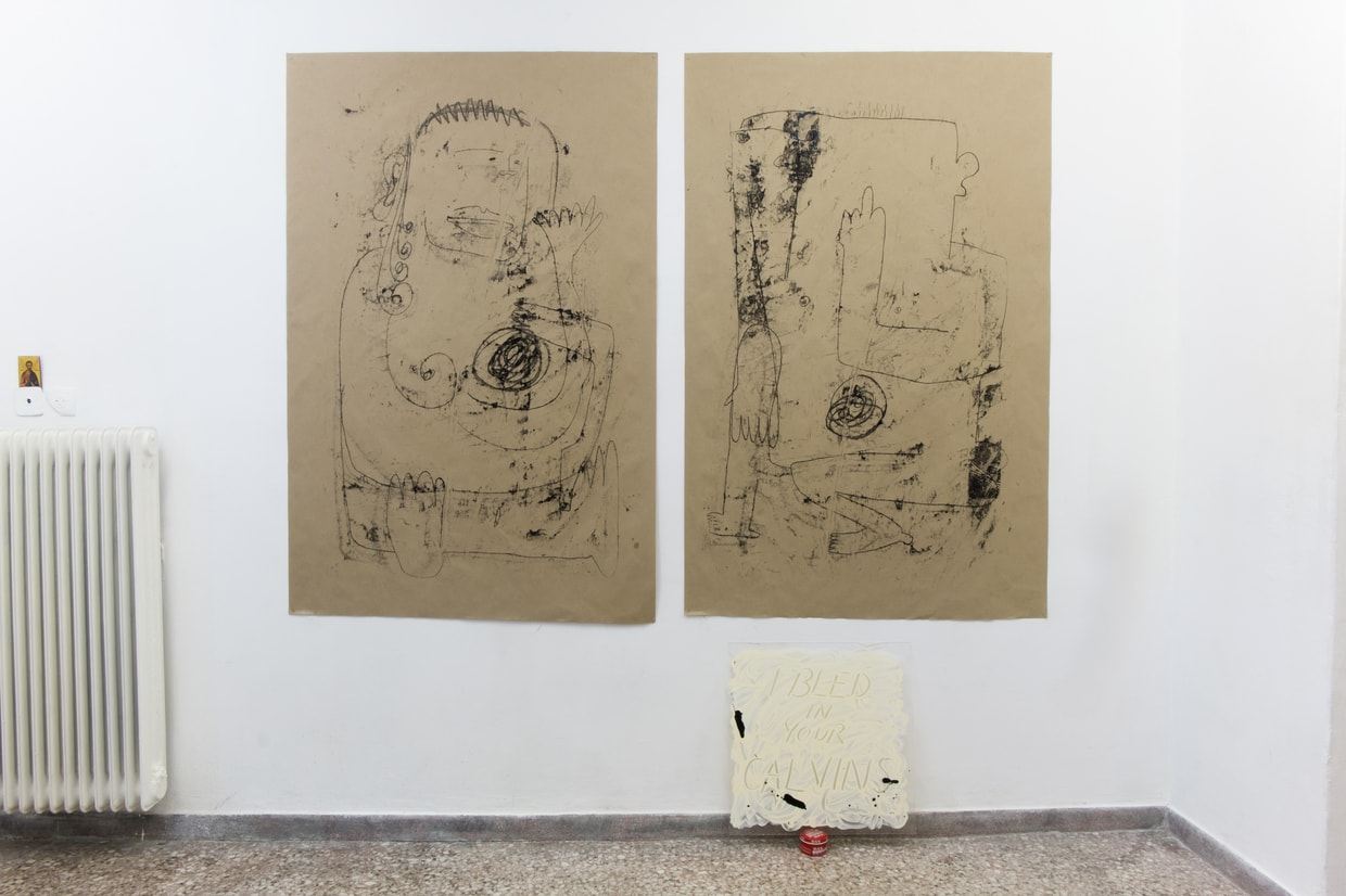 Visiting “Mine, Others and Yours”, a joint exhibition of new work by Greek artist Aristeidis Lappas and Berlin-based Sophie Vallance Cantor at WE ARE BUD project space, somehow feels like you are trespassing on the artists’ inner thoughts. Although quite different in style—Vallance Cantor’s work stands out in its unapologetic rebelliousness, full of bold brushstrokes, vibrant colors and brash slogans, whereas Lappas’s elicits a quiet introspection, distilled in monochromatic, faint, almost indiscernible forms—both artists’ work is characterized by a sense of spontaneity, a child-like expressiveness and a cathartic immediacy. Behind these similarities lies an urgent need to externalize their state of mind: a common willingness to expose their thoughts in the most raw and uncensored manner in an attempt to discover their selfhood.