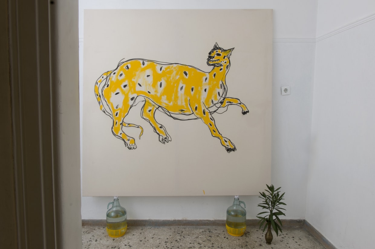 In Vallance Cantor’s “CONSTIPATED AND ANXIOUS II”, a 1.7 by 1.7 meter oil and charcoal canvas that takes over the room it occupies, a clearly distraught cat, enlarged to fill most of the surface, bares her teeth in discomfort, perfectly capturing the title’s description. The work, propped against a corner on two rolls of toilet paper, is complemented with a runner rug ceremoniously leading the visitor to the painting, on top of which a bowl of white flowers is placed. The set-up elicits a religious act of adoration—where the painting is the altar-piece, the flowers an offering and the rug becomes a prayer mat—albeit one that should not be taken too seriously, as the painting’s epigraph “HOLY FUCK” attests. Accompanied on either side by two small line-drawing by Lappas that occupy a liminal space between mysticism and doodling, the room thus becomes a space where spontaneity and self-awareness meet in reflection.