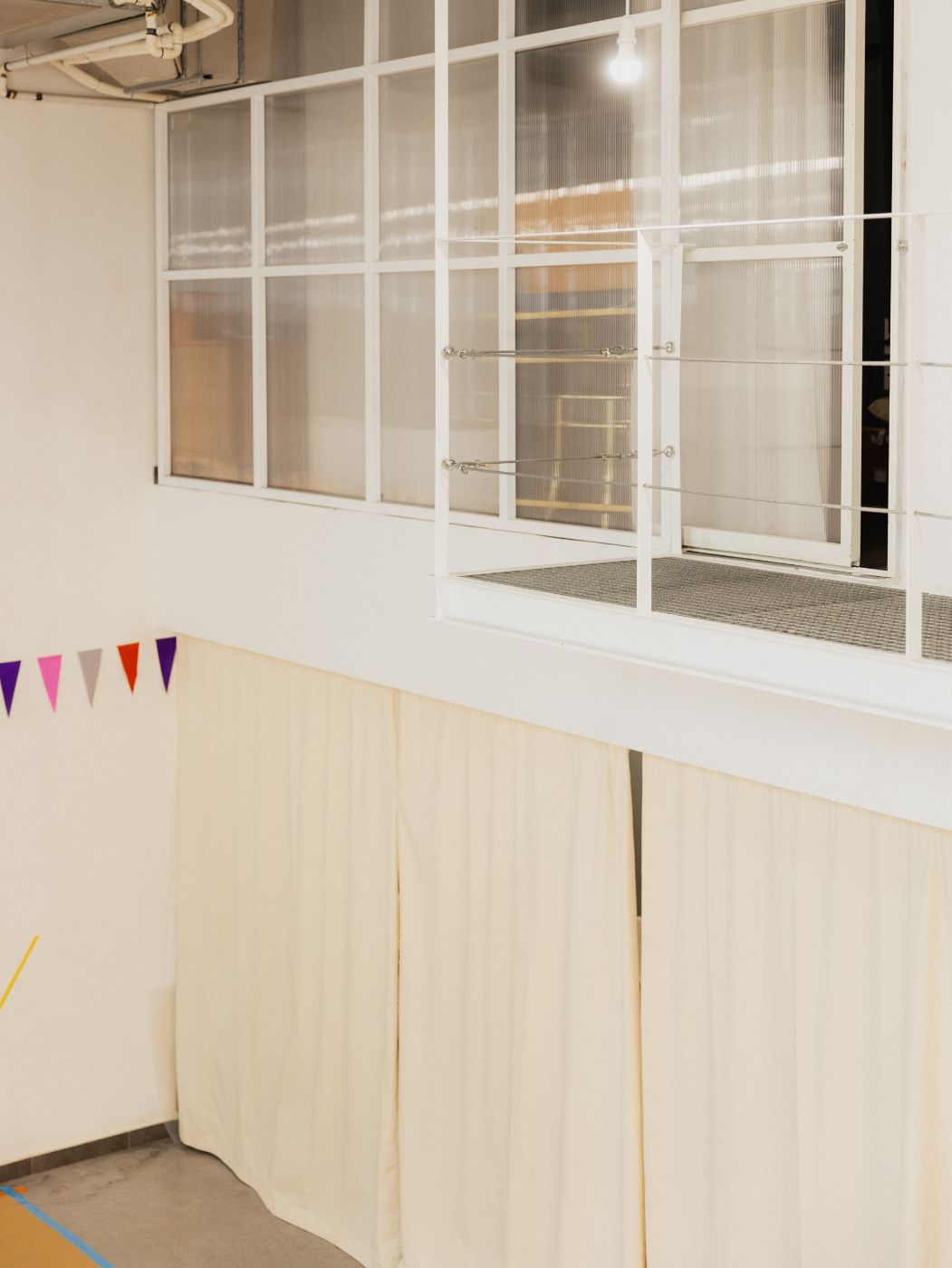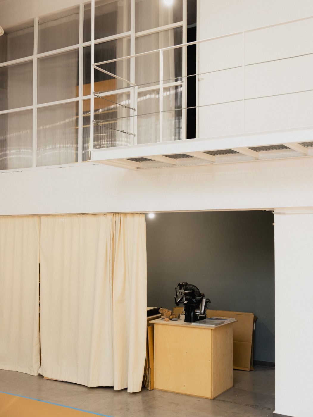 Now the main area of the house is a white cube-like space with unusually high ceilings and a lot of natural light coming in from new windows. The second floor only takes up a part of the building, so that the exhibition space uses two floors in height. Behind curtains on the ground floor one can find manual printing machines, a kitchen, and bathroom, as well as a small library with a seating area. Upstairs there is another bathroom, a bedroom, and an office.
