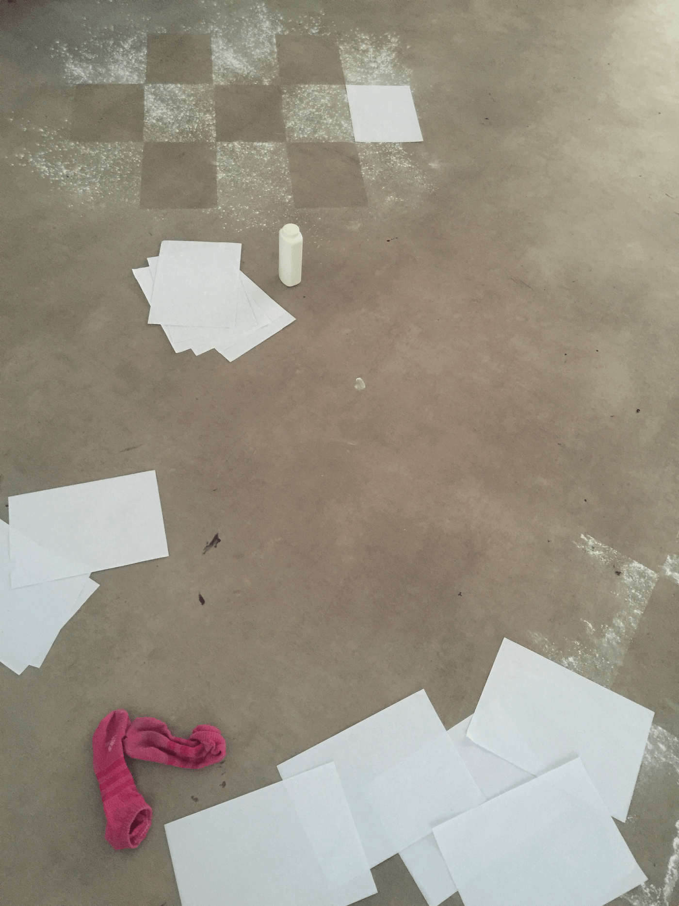 It's an elevated space in the city centre — ground floor, first floor, second floor — the third floor is cool with air conditioning and smells of something safe — whiteness all over, and a grid on the floor — how perfectly tidy these rectangles are — Andrius Mulokas made them by laying down A4 paper in a checkered pattern and sprinkling talc over them — he then removes the paper and a grid of white powder remains on the vinyl floor — Macklin says something about the Commercial Triangle and the city centre — from that moment all I can see on the floor is the urban grid, blocks of buildings, gaps of urban fabric as temporary layers of powder — some rectangles have already been stepped upon with a socked foot — I guess my life at the moment has the same fragile order as these powdered frames — how tidy it all is until you drop your keys or a person walks in unannounced — Andrius speaks softly into a microphone — his voice is coming from an amplifier behind him — it's so strange to have a person speaking to you softly in your face and his voice coming from the other end of the room — a pair of pink Adidas socks appears — a connection is made — the powder moves, the body moves — he makes a new pattern of powder rectangles next to George's feet — the powder falls softly on the floor, like ceiling dust during an earthquake — the bottle is empty now, he drops it on the floor too — he removes the paper, leaving behind blocks of dustless gray — the fluorescent lamps are so white — debris is gathering slowly: a shoe there, a bottle here, a bag, a plastic sheet, the microphone — distractions, but what for — the music is meditative, like a sermon from a trusted priest in slow motion — this room is the bottom of a bright pit gathering the dust of a life high above — the sun is down, the sun is down — we are tasting the ash of someone else's volcano — we are the white sediment of a saline solution of tears — a friend arrives late in Pride attire — Andrius forces him to read a text as he carries him on his shoulders — his feet are tangled in the microphone cord — a constant feeling of muted threat — he's threatening us with his apparent naivety — distracted again by a beautiful tall child — ballet’s only contribution to a person’s development is not a sense of discipline but elegant arms for a lifetime — a dry branch against the wall, his fingers stiff in the air — he asks a woman to paint his hair, and she obliges — pink, green, blue and yellow get mixed, ending up in a brownish blob of once-blond hair — he talks about how he wants to change the origin of things — to change things to the point you cannot tell where they're from —I'm thinking of wandering bodies without roots — origin as a privilege — he pirouettes clumsily and slams his knee cap into the floor — the audience asks him to dance with his stick — he removes his clothes and wraps a shirt around his waist — the music changes, he is frantic — dancing around like a tribal warrior, exhausting himself — he breaks the stick on his left thigh — blood glistens, dust rises — he can't hold it for long and collapses — he asks us to leave whenever we want — we are all about to, but he moves again — he begins improvising on the floor with his eyes closed — a landscape of pristine talc rectangles scattered with debris — and a slender hairless Caucasian body writhing and blind — he feels his way around as he floats — I can swear he's floating in the air like a Chinese dragon — but it's the floor, it's just the floor, and the twilight fading away — flesh slamming again, skin slapping the building — and what a release it all must be to be oblivious of the past — what an excruciating happiness to be origin-less, a ripe mandragora root running free across the steppe — the corpse of an albino whale is sinking into the depths of the sea — a hazy saline solution of tears — it slams soundlessly head-first into the gray sand that is the vinyl floor — he has landed in peace, and we are back in the gutter.