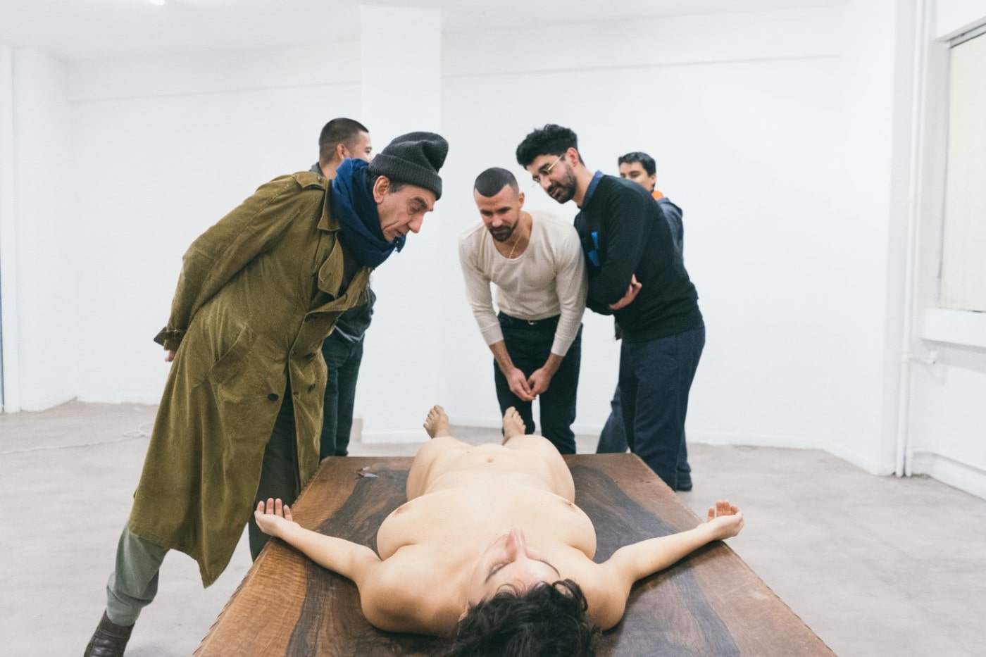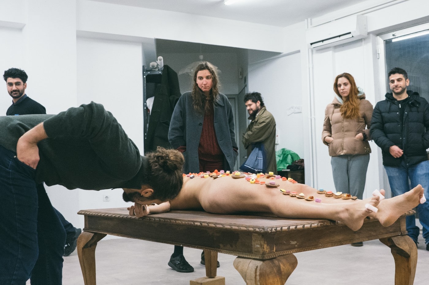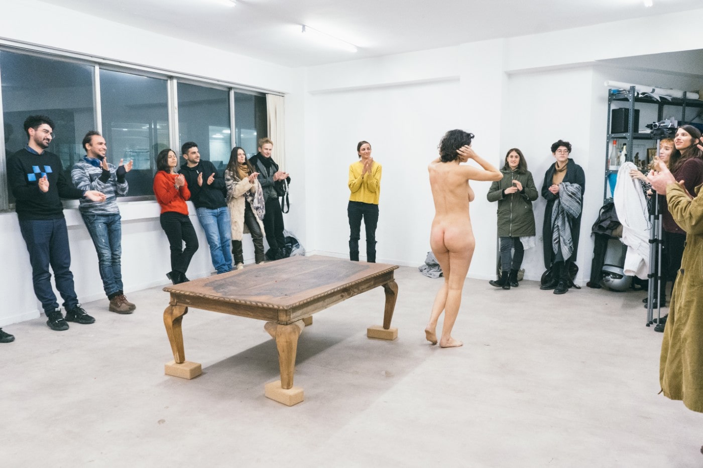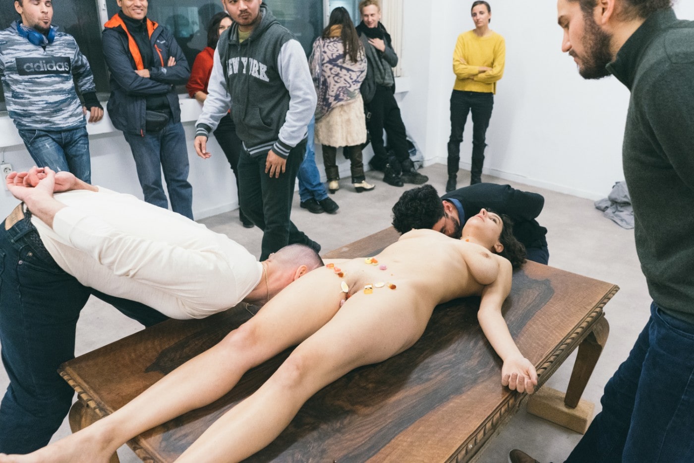 Through this work I try to challenge the participants’s relationship with the female body, while I essentially create a circumstance in which they have to act together as a team to finish the performance. I am interested to see how their perception of the female body constantly shifts and transforms during the performance, from a naked woman to a soulless object, from an altar with its offerings to a potentially erotic object.