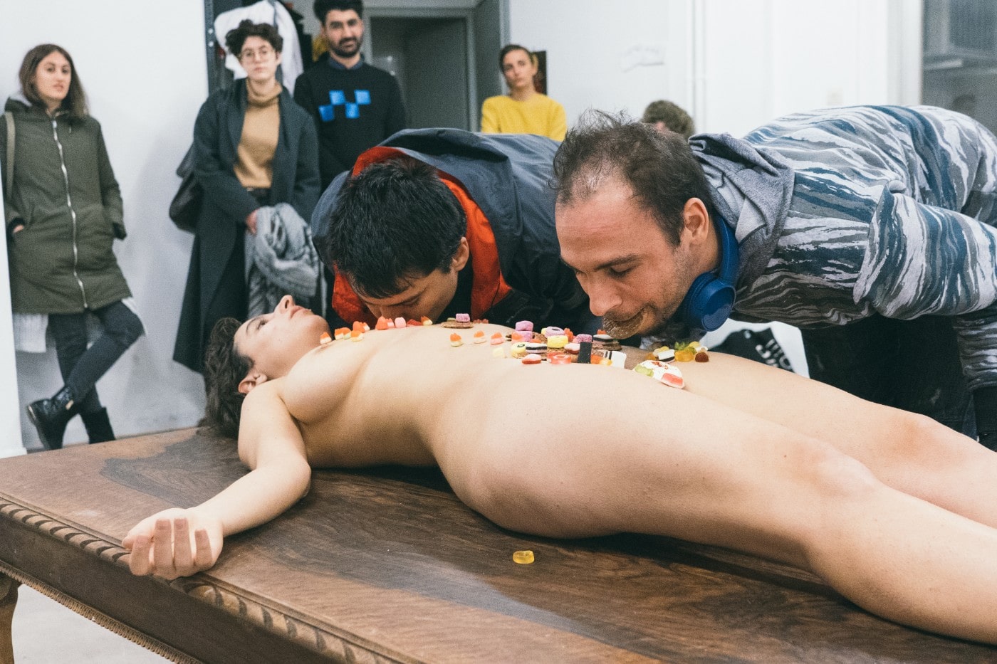 In a recent performance at Sub Rosa Space, Athens-born, Trieste-based live artist Nina Alexopoulou presented The Candy Piece, a participatory performance where the audience is asked to consume large quantities of candy placed on the performer's naked body as she's staring at them voiceless and motionless. On the occasion of the work's first presentation in Greece, we asked her a few questions about The Candy Piece and the evolution of her practice over the past few years. The documentation of the evening is by Alexandra Masmanidi.