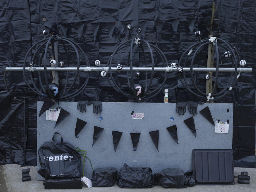 Gold Rush is about a pipeline that goes from the Kaspian Sea through Azerbaijan and Turkey, then runs through Greece to Italy and beyond. The most important detail though is that it passes just outside my village in Macedonia, which is a place known for its peaches. Growing peaches is all people used to do there. So the pipeline came and the company started asking people in the village if they wanted to give their land to build the pipeline. My father had a little piece of land along this creek and they asked him if he wanted to give it too. So one summer afternoon I saw him sitting on a plastic white chair signing with the company people to give them the land. And he did that very easily, because he’s not making a lot of money from peaches anymore; he’s retired and growing peaches is like his hobby. He would get some money as compensation and we were all very happy to be honest. But the scene where my father gave away the land and everything it stood for (the peaches, the village) so easily, as if they weren’t important at all, made me want to make a series of photographs that have to do with the “after”, what happens after all this. A series about people from the village who instead of selling peaches they get their money from compensations from the pipeline company. And what do they do with that money. I also made a connection with the Gold Rush in California and boomtowns, so I decided to make my own boomtown. I imagined the village developing and everything changing, that there would be bridges, gambling, prostitutes, all sorts of scenarios.