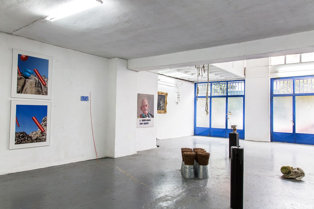 Fragile as pine needles may be, they appear strong and steady in Martha Dimitropoulou’s six bongo-shaped sculptures, half metal, half pine needles. The harmony of the geometry juxtaposed with the spikey texture, recalls equality and the power of the masses. The natural and the man-made are also juxtaposed in Pantelis Vitaliotis/Magneto’s works, both of which depict a photograph of a real landscape with scattered red and blue toy-like objects. The artist’s realization of a space unveils the limitations of our perception on what is real. In the realm of the fantastic, the half cut upper torso of a unicorn that Dimitrios Antonitsis creates from metal and adorns with semi-precious stones, recalls the mutilation of the imagination as one becomes a conformed grown-up. Vasilis Zografos’ painting of a curvy horse stands in for the wholeness of the horse figure and as its head is turned to the right, the eye foes to the painting of a porcelain vase, whose roundness echoes the horse’s and is further reinforced by the round wrap of the painting’s paper.