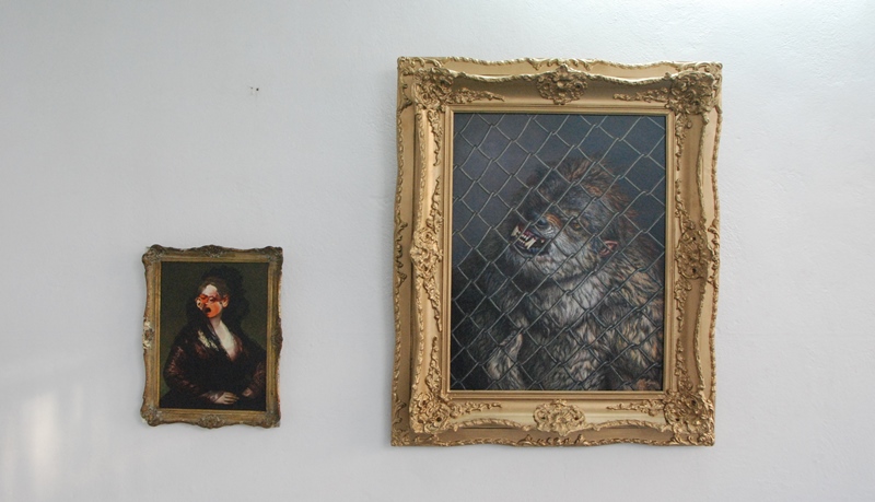 Antonis Larios’ Mr Beastman behind a Fence portrays a human-animal hybrid posing behind a fence, in a golden heavily adorned frame. Reminiscent of the circus monsters and bizarre objects related to the Cabinets of Curiosities. The fence provides a secure distance of the viewer from the figure, implying the distance from the extrinsic and the foreign, in fear of it, otherwise known as xenophobia. An ambiguous figure can also be seen in Artemis Potamianou’s The Unknown Masterpiece which depicts a female portrait with a collage of a torso, different eyes, different ears and different mouth, wide open as if moaning passively or trying to speak. The painting is presented in a heavily adorned old-fashioned gold frame that suggests a worn glam of the past. The direct reference to the homonym book by Honoré de Balzac, The Unknown Masterpiece (1931) raises questions on absolute beauty perfect masterpiece, shading light to the overlooked contribution as well as limitation of the women’s role in art history. A quite different portrait is displayed diagonally at the opposite side of the room. It is the only non-contemporary work on the show.