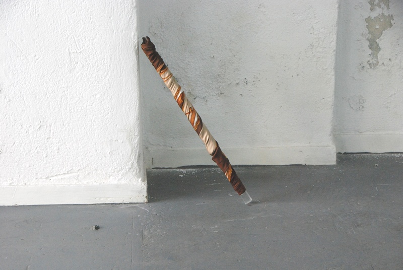Superstitions pass from one generation to the other, weaving an unseen bondage of the present with the past. In Iraklis Fovakis’ work, a plexiglass frames a folded shirt made by a sough of a 4.5 boidae snake, a female tie made of pearls and a red velvet handkerchief matching the red velvet lining. The many faces of the symbol of snake comes to mind: the therapeutic symbol in ancient Greece, the emblem of medical science, the personification of the devil in the Bible and the chthonic creature of the underworld. Linked to the Greek tradition where the snake skin is a lucky charm, Fovakis’ artifact stands out like an amulet ready to be embodied physically and mentally. One has to believe in superstitions for the charm to be effective. Therefore, the charm stems really from within. Greek tradition is also reflected on Nicolas Vamvouklis’ Study for a support structure. The silk scarf wrapped on a plexiglass cylinder calls to mind the folk culture and performativity. Direct references are made to his homeland, Lesvos, the Bull Festival of Agia Paraskevi, where faithfuls hang silk scarfs on the animals as votive offerings and the Greek panigiri festival with its street sellers. A ready-made scarf of massive production, once combined with the plexiglass and presented in an art space questions what is perceived as high art.