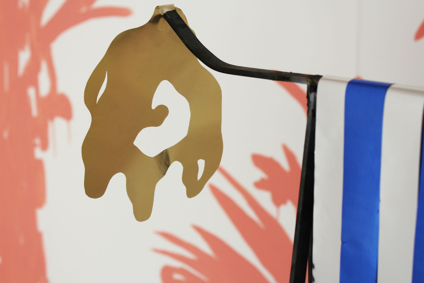 In this work, the artist uses perishable materials such as metallic paper in combination with metal and plaster to create sculptural gestures that manifest like three-dimensional drawings, creating an architecture of tension and negative space that the viewer has to navigate and reflect upon. The shiny paper ribbons, although speaking of celebration and joy, are at the same time impermanent and frail. Meanwhile, three fluorescent lamps in different colours illuminate the space, and make the sculptures cast a triple shadow on the floor, which adds to the work’s ambiguous tension.