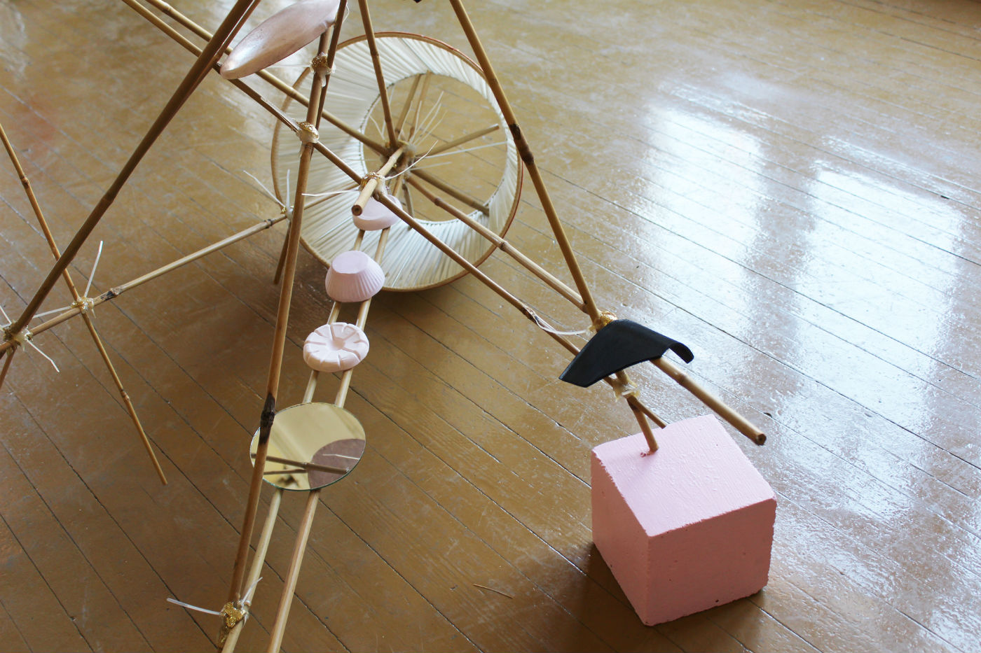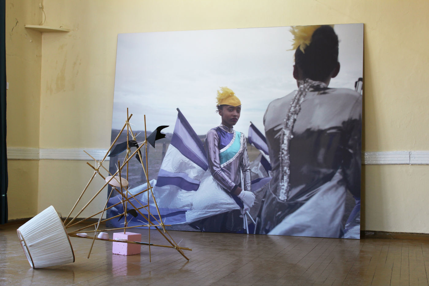 One of the most prevalent themes in How to Fall with Grace is that of transformation of identity through ritual. The voluptuous work of Valinia Svoronou (Dense Coat Configuration, 2017) is particularly resonant in this case, as it evokes a wolf’s hide. A glamorous performance by Pierre Magendie during opening night (Ite Missa Est, 2018) parodies the ceremonial through an extravagant display of handmade costumes and a looped sample of Guillaume de Machaut’s Ite, Missa Est (played live on a recorder by the performer). On the same note, Zoe Williams’s Ceremony of the Void (2017) is a video showing a fantastical banquet that gradually transforms into a frenzy. Next to it, a sculpture by Nana Sachini (Collection of Unfinished Houses, 2013) confirms the show’s domestic element and tells a story of coming-of-age by balancing pink desserts on a teetering bamboo structure tinted with golden glitter.