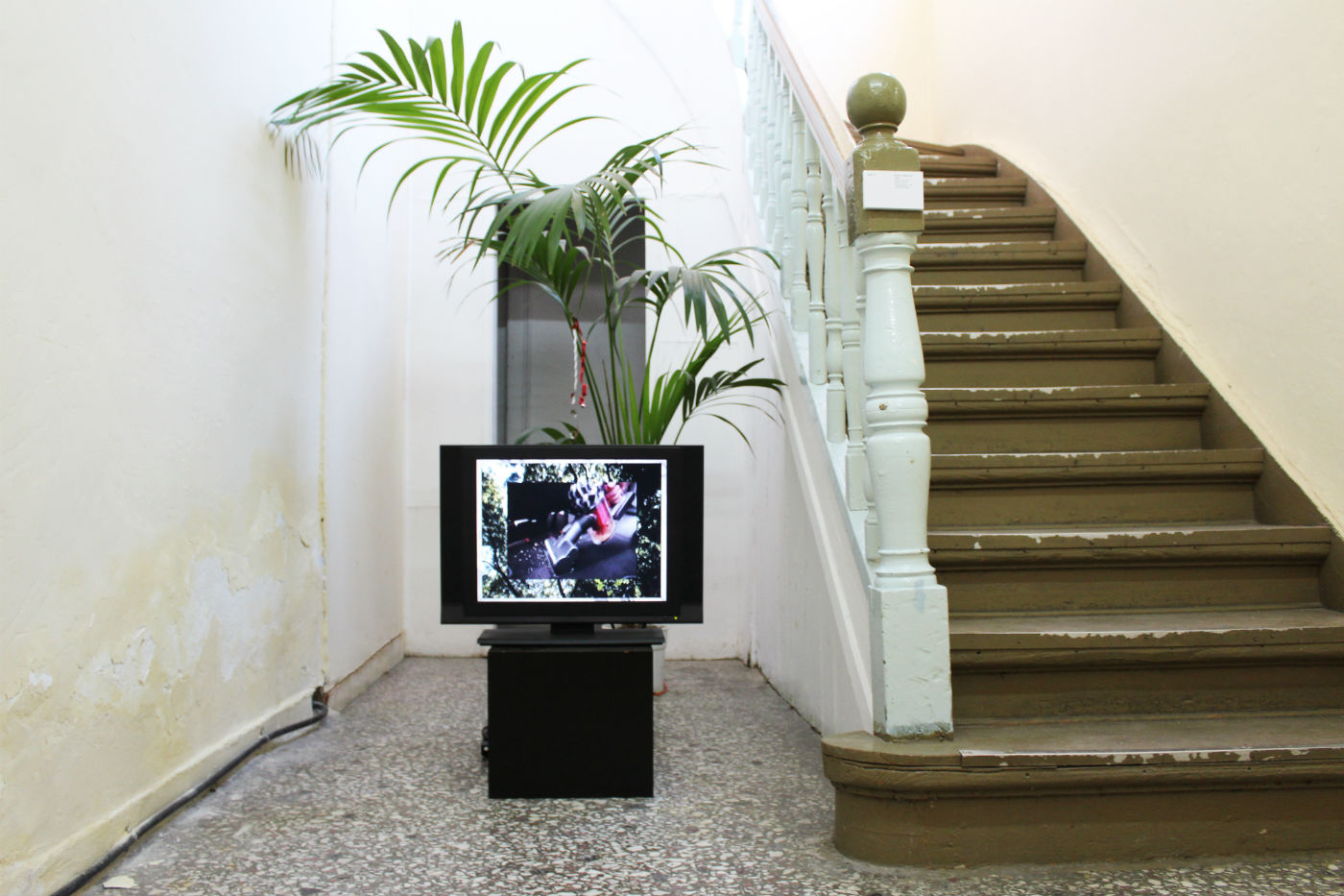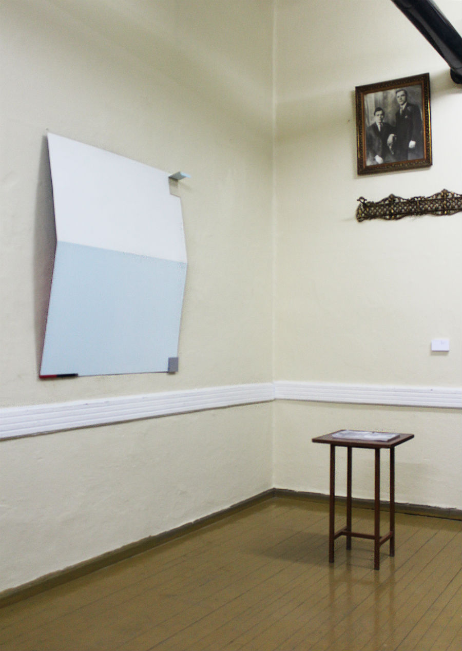 As part of this year’s exhibition, K-Gold Temporary Gallery invited Antwerp-based artist Yorgos Maraziotis to create a new work inside a former shop on Arisvi Club’s ground floor. A continuation of Maraziotis’s recent work on historical trauma, identity and violence, the installation A Still Life (The Evening of 17th October 2037) (2018) consists of a group of fragile sculptures scattered in the space, a mural painted in situ and fluorescent lighting illuminating the space.