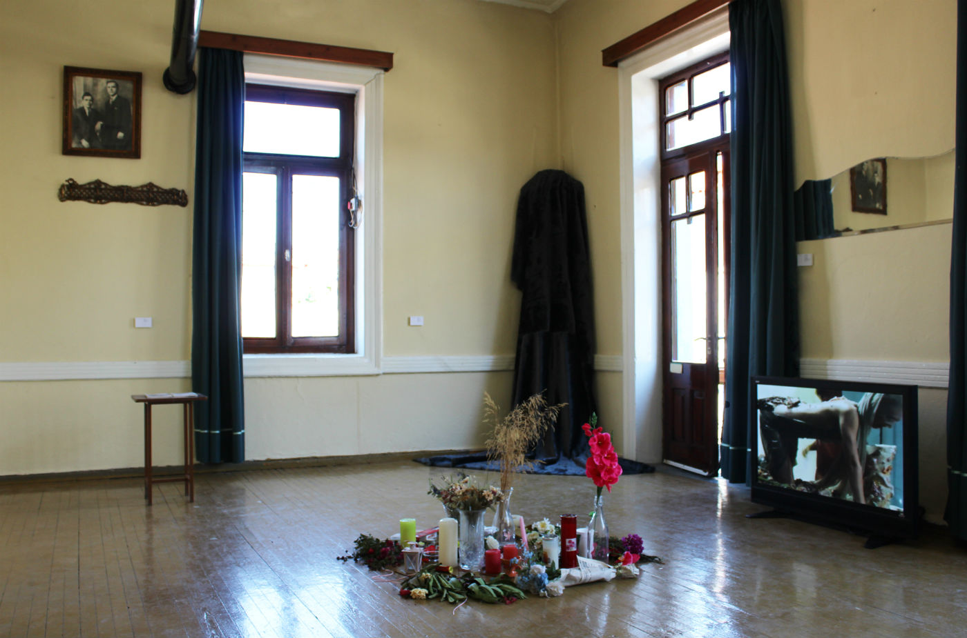 Situated on the upper floor of an old building right in the middle of the town, Arisvi Club retains its original wooden floors and furniture, with the whole setting reminding of an old middle-class salon. This feature was one of the reasons why the venue was selected for this exhibition, as curator Nicolas Vamvouklis evidently wanted to highlight the domestic and private aspects of celebration, and create a link with consumption and the debauchery of private parties.
