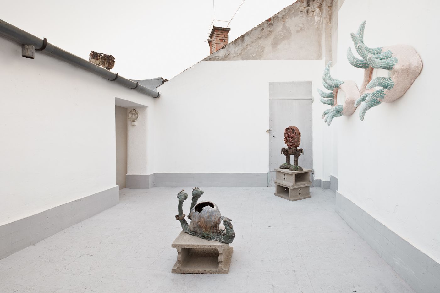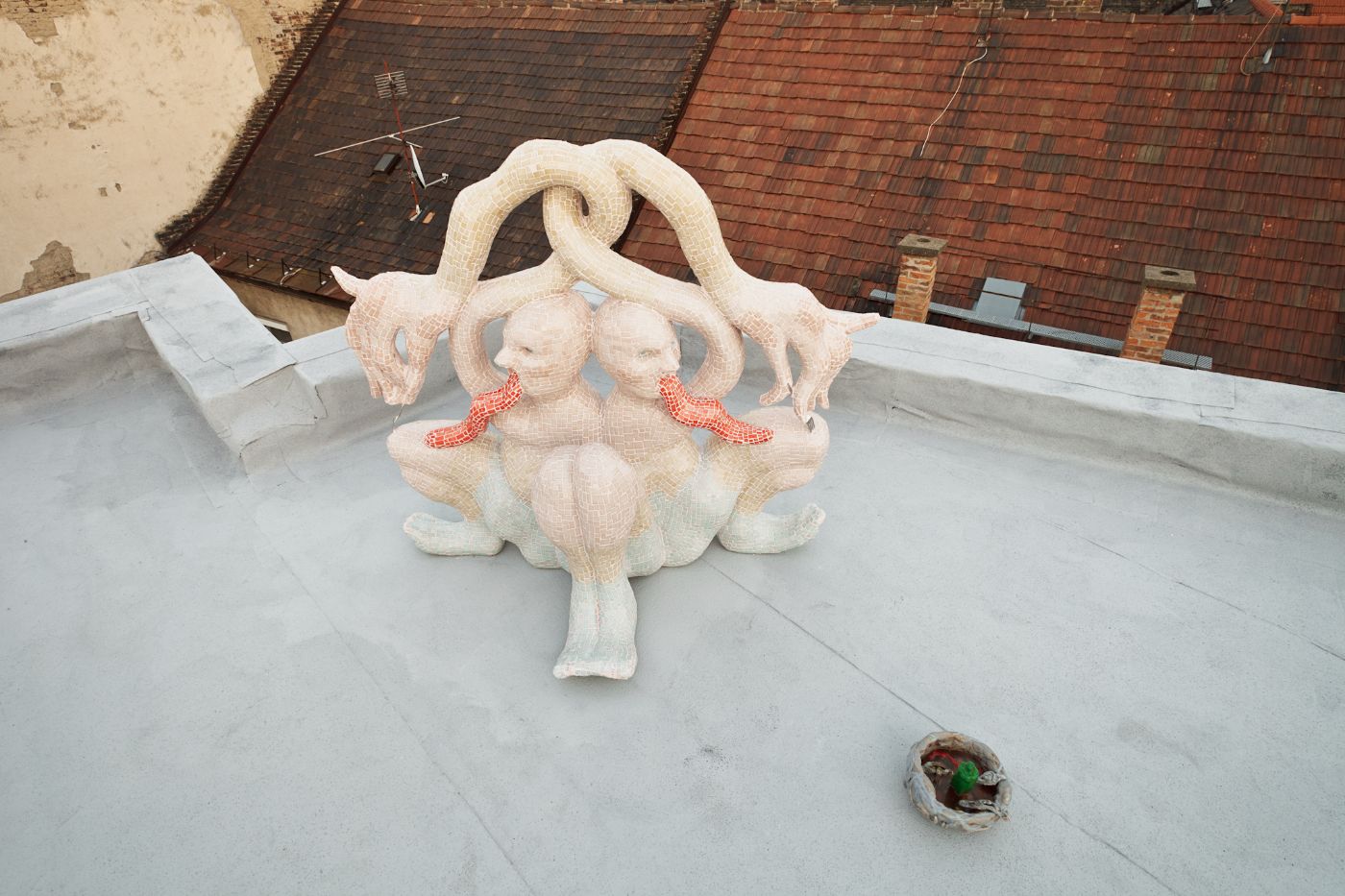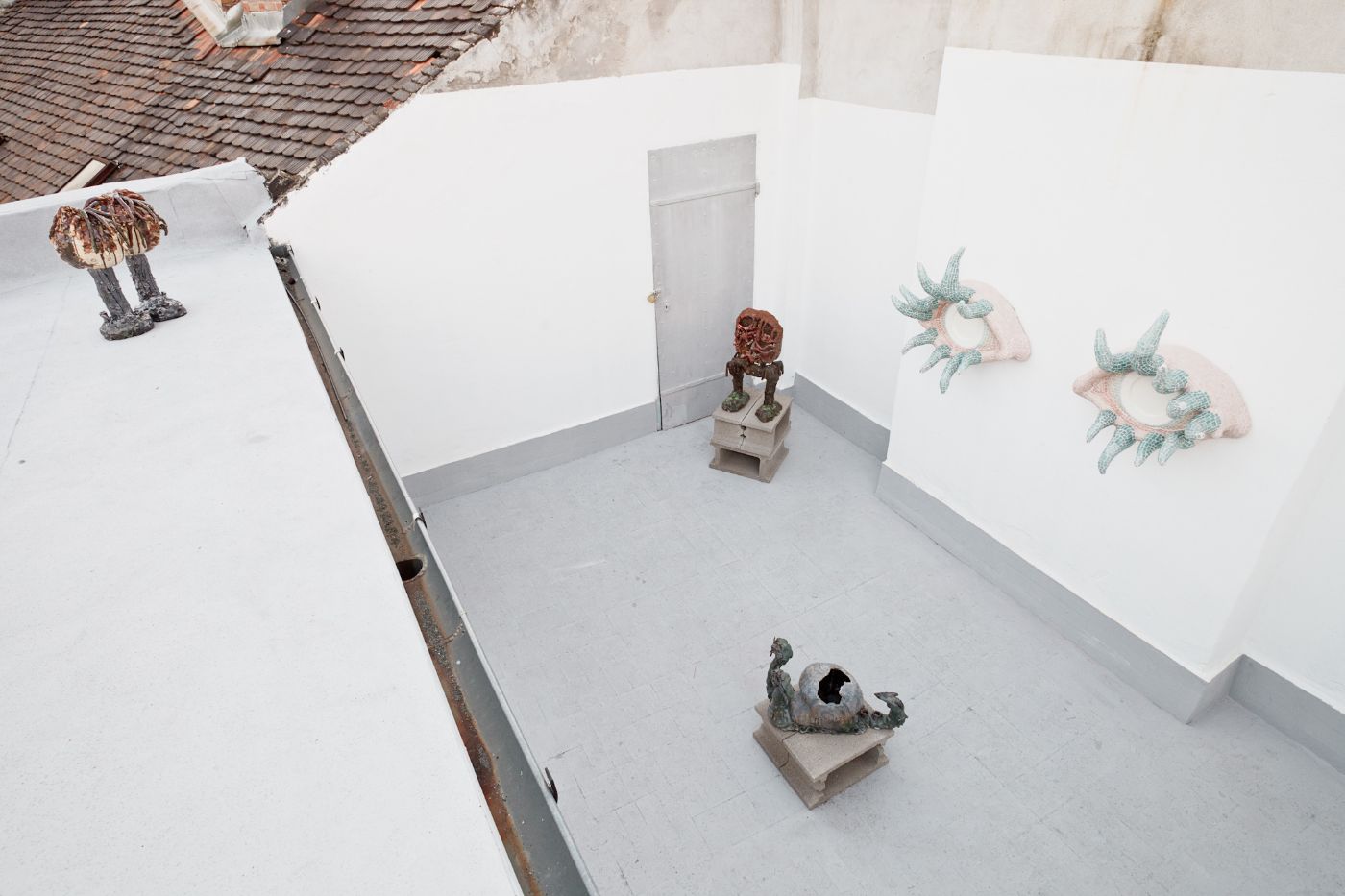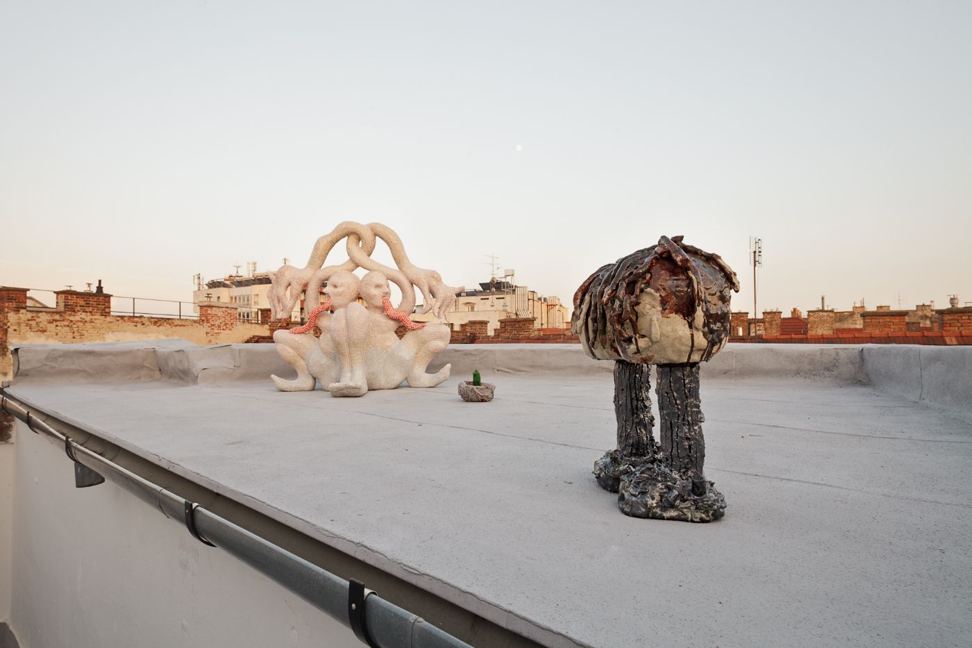 In Sunbaked Thirst With Love, the open-air, rooftop gallery of ENA Viewing Space in Budapest is populated by strange creatures and mystical totemic entities by Tom Volkaert and Zsófia Keresztes. The exhibition touches upon issues of hybrid identities and virtual cannibalism, as seen through the eyes of two young European sculptors.