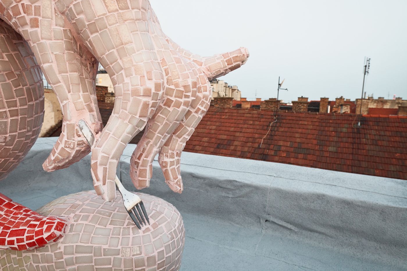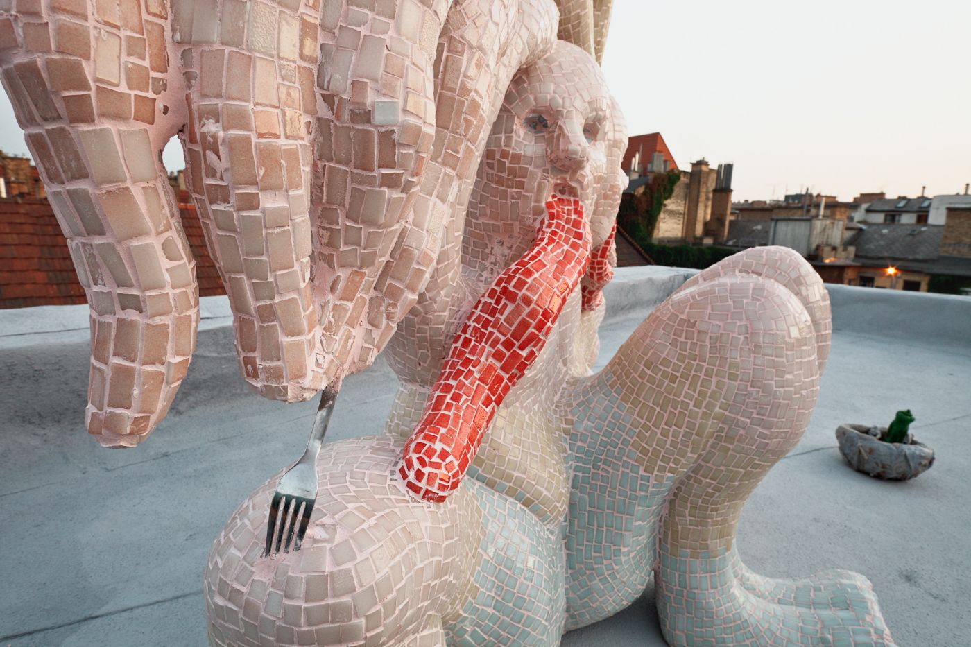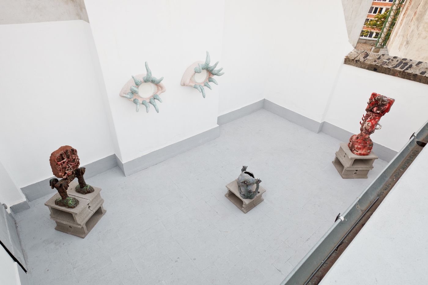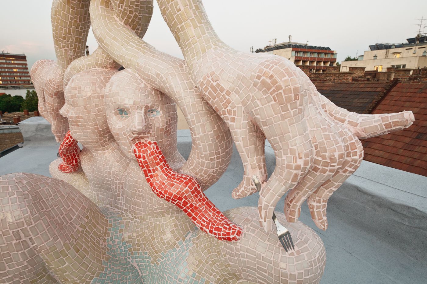 In Sunbaked Thirst With Love, the open-air, rooftop gallery of ENA Viewing Space in Budapest is populated by strange creatures and mystical totemic entities by Tom Volkaert and Zsófia Keresztes. The exhibition touches upon issues of hybrid identities and virtual cannibalism, as seen through the eyes of two young European sculptors.
