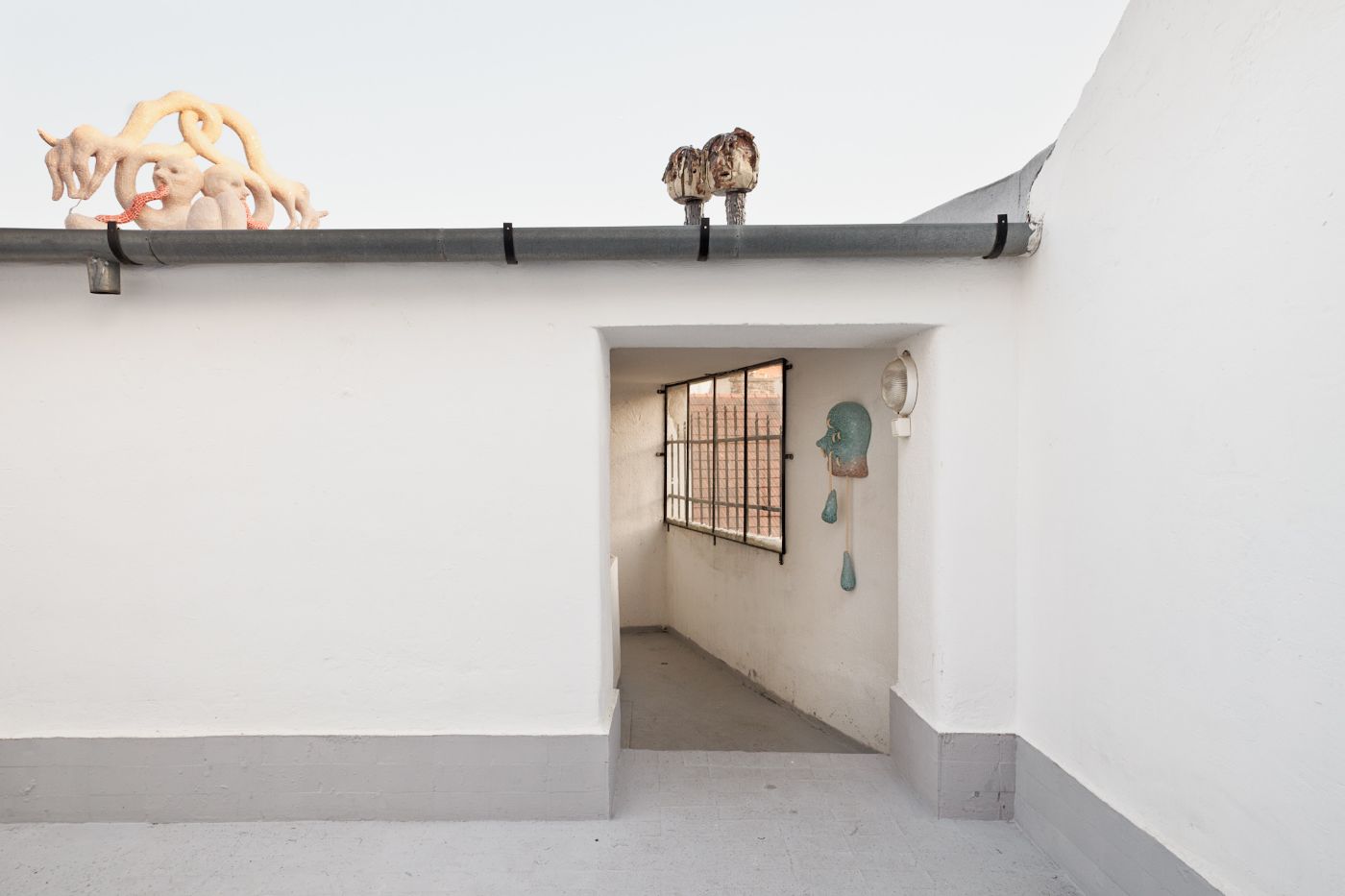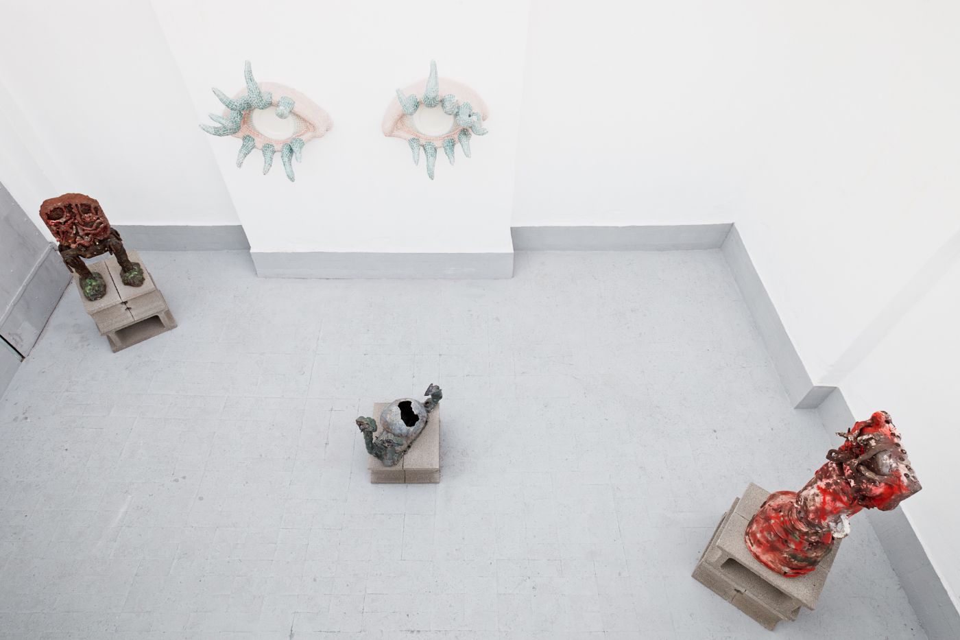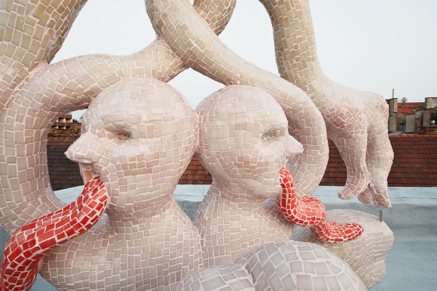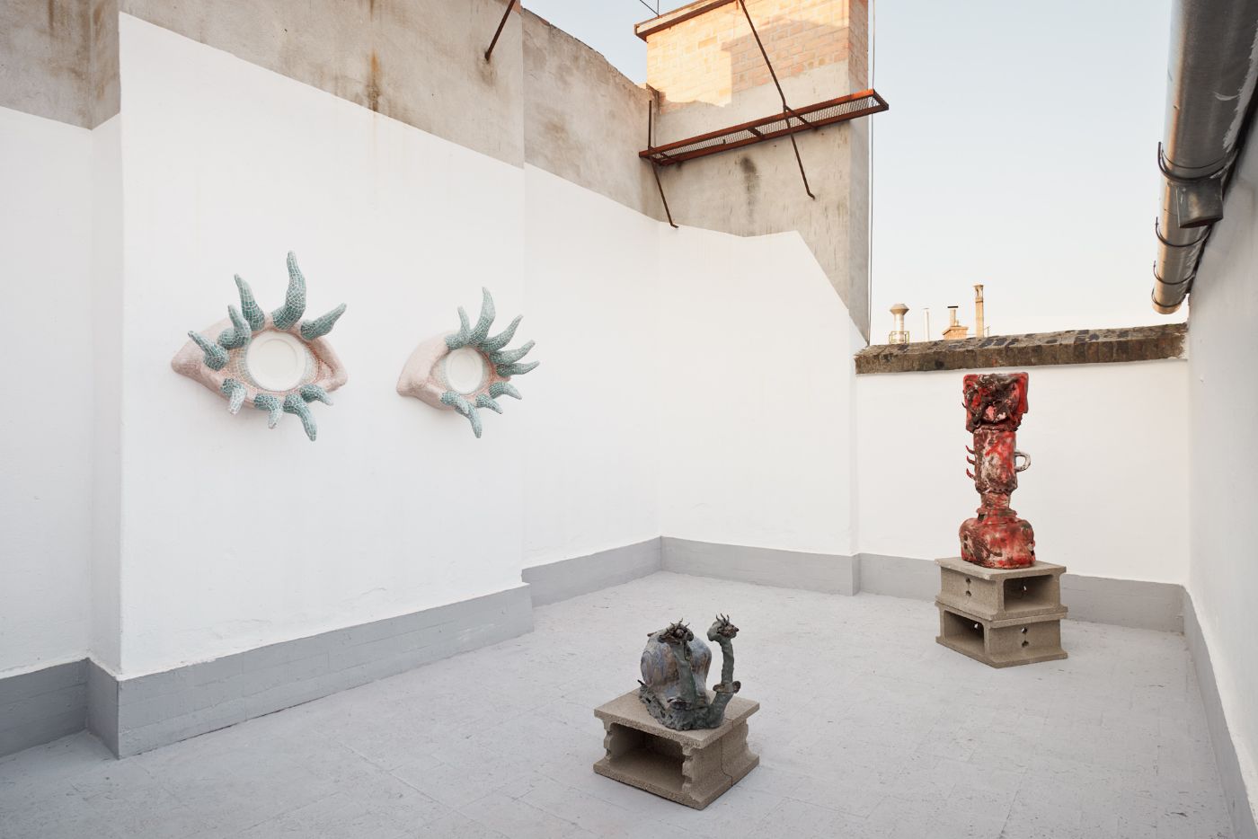 In Sunbaked Thirst With Love, the open-air, rooftop gallery of ENA Viewing Space in Budapest is populated by strange creatures and mystical totemic entities by Tom Volkaert and Zsófia Keresztes. The exhibition touches upon issues of hybrid identities and virtual cannibalism, as seen through the eyes of two young European sculptors.