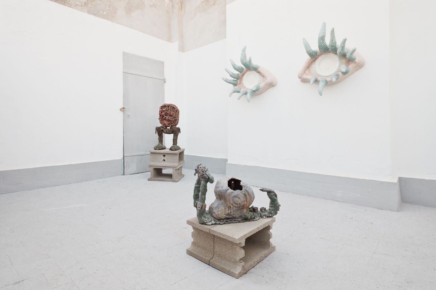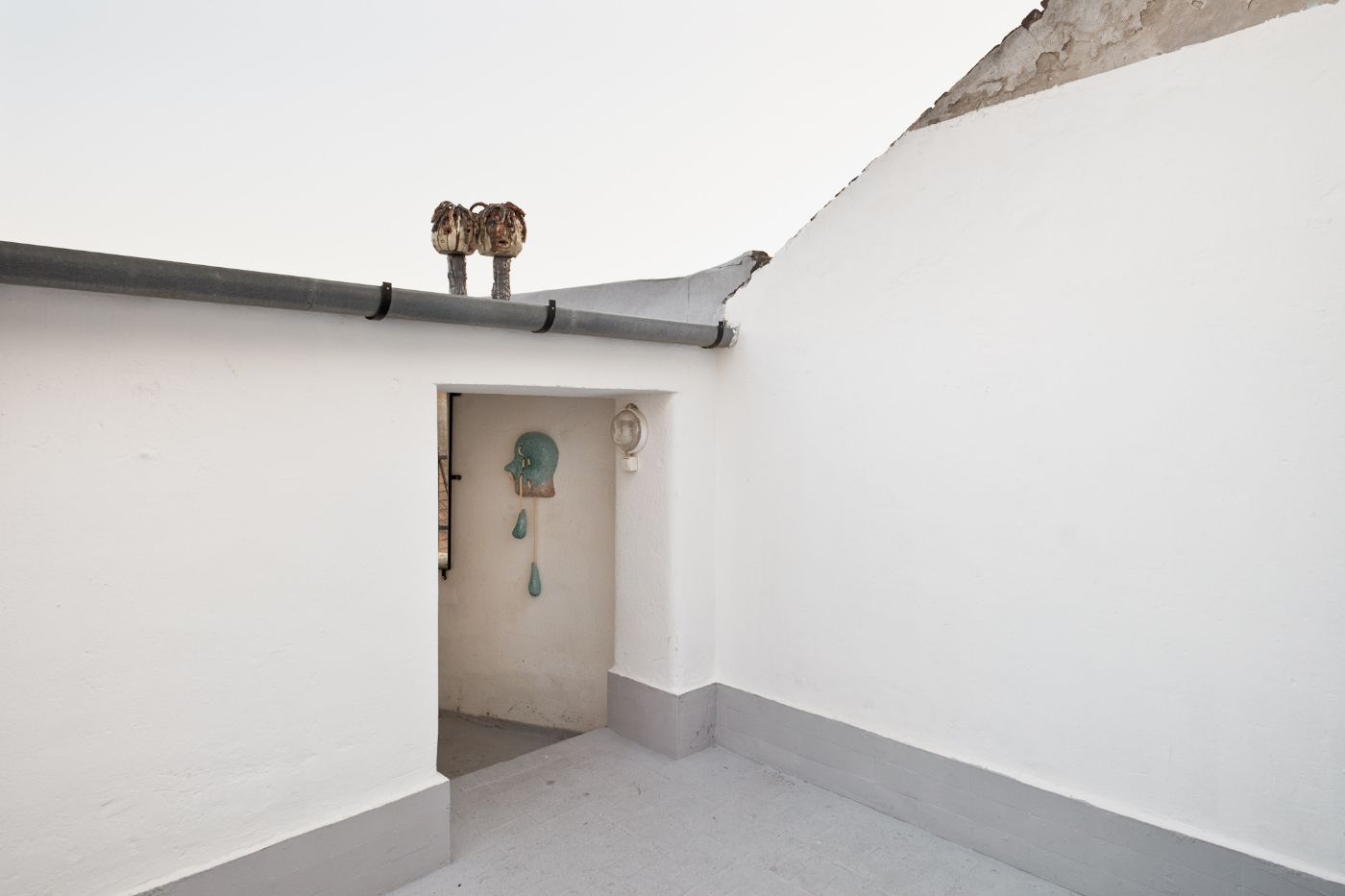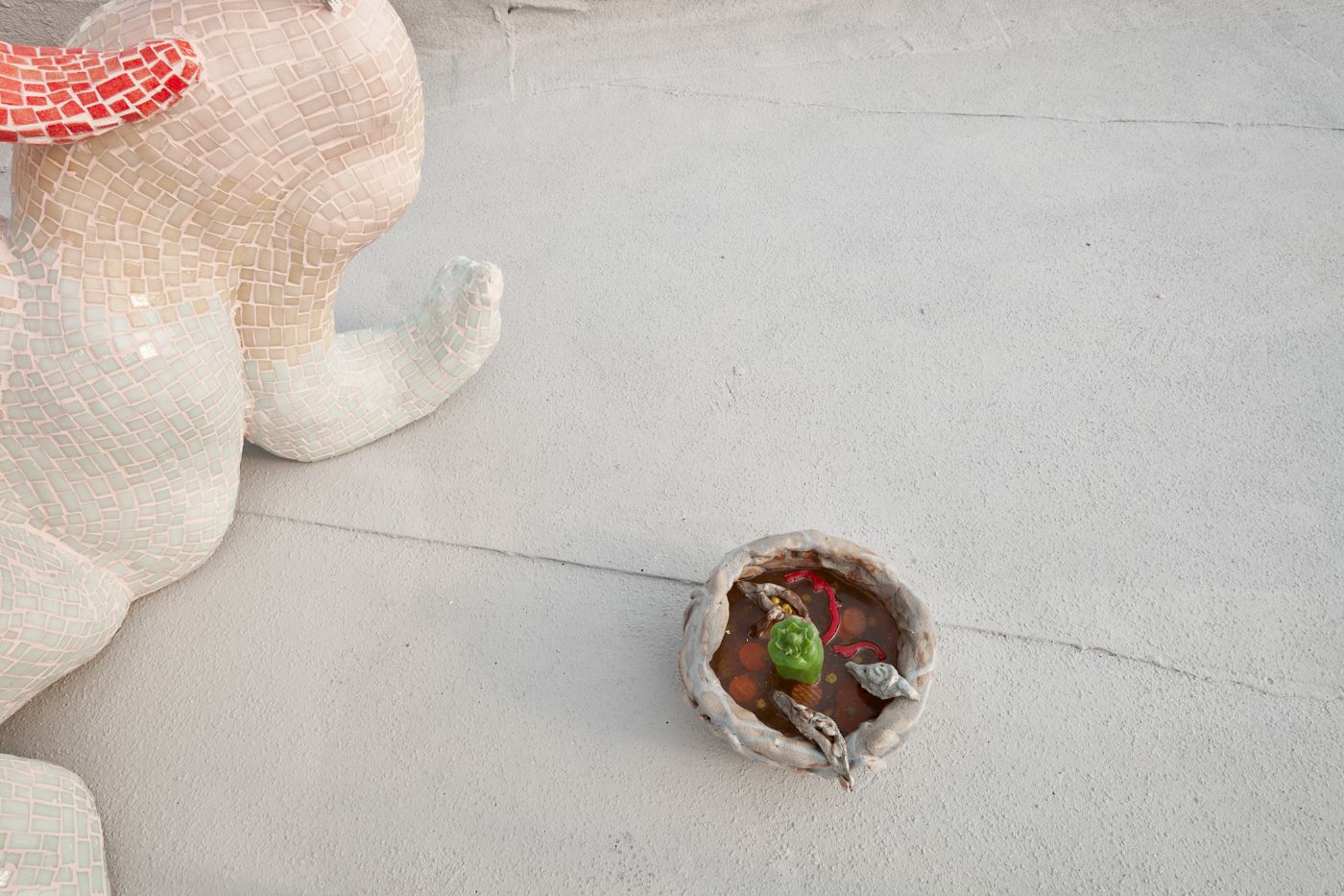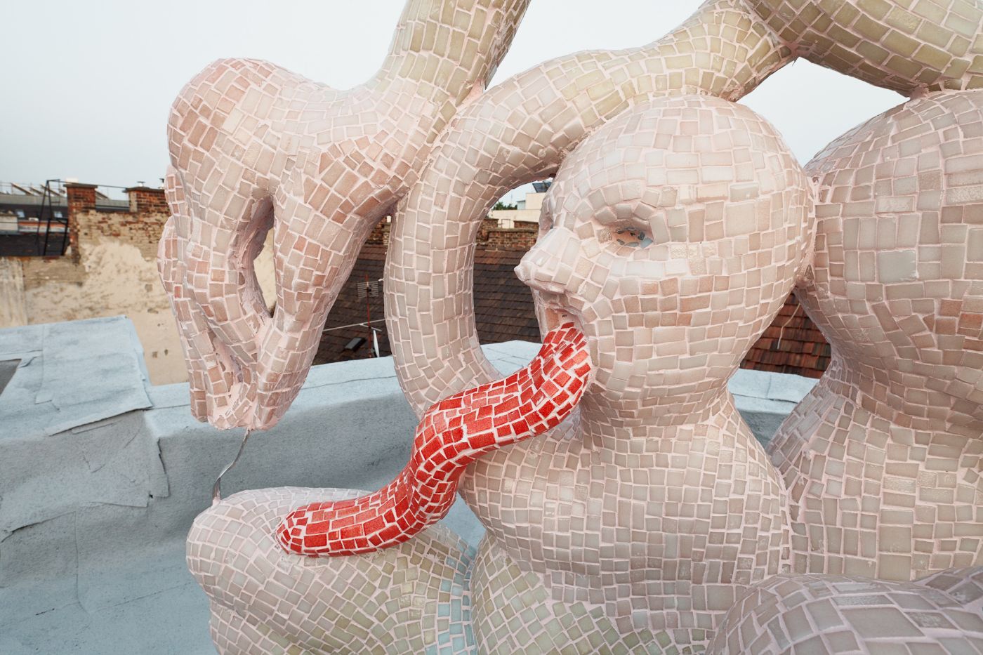 In Sunbaked Thirst With Love, the open-air, rooftop gallery of ENA Viewing Space in Budapest is populated by strange creatures and mystical totemic entities by Tom Volkaert and Zsófia Keresztes. The exhibition touches upon issues of hybrid identities and virtual cannibalism, as seen through the eyes of two young European sculptors.