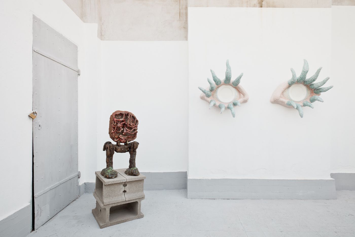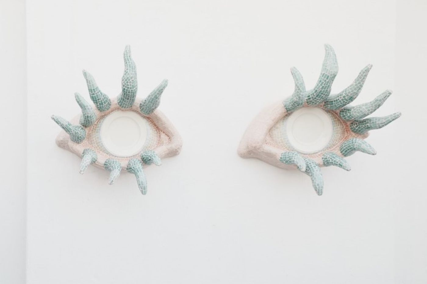 Images of hunger, thirst and raptorial behaviour abound, as seen in Keresztes’s wall-mounted “carnivorous” eyes and Volkaert’s totem with claws. However, the works seem hardly intimidating due to their playfulness and strong sense of irony. Both artists deal with a strange union between biological and artificial components, something that manifests as animalistic symbiosis in Volkaert and blissful ingestion and surrender in Keresztes.