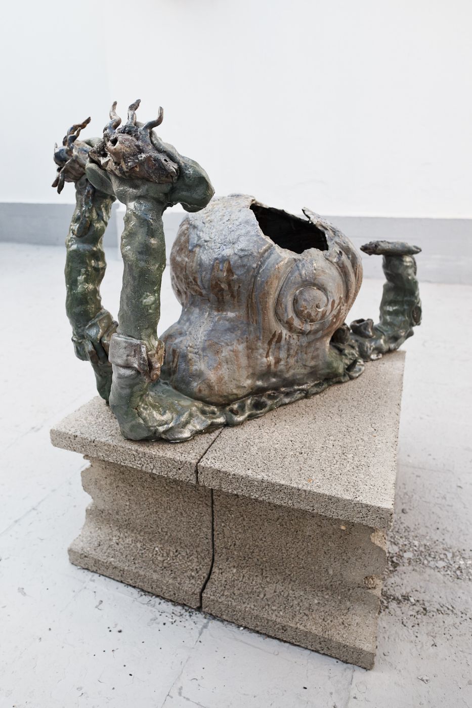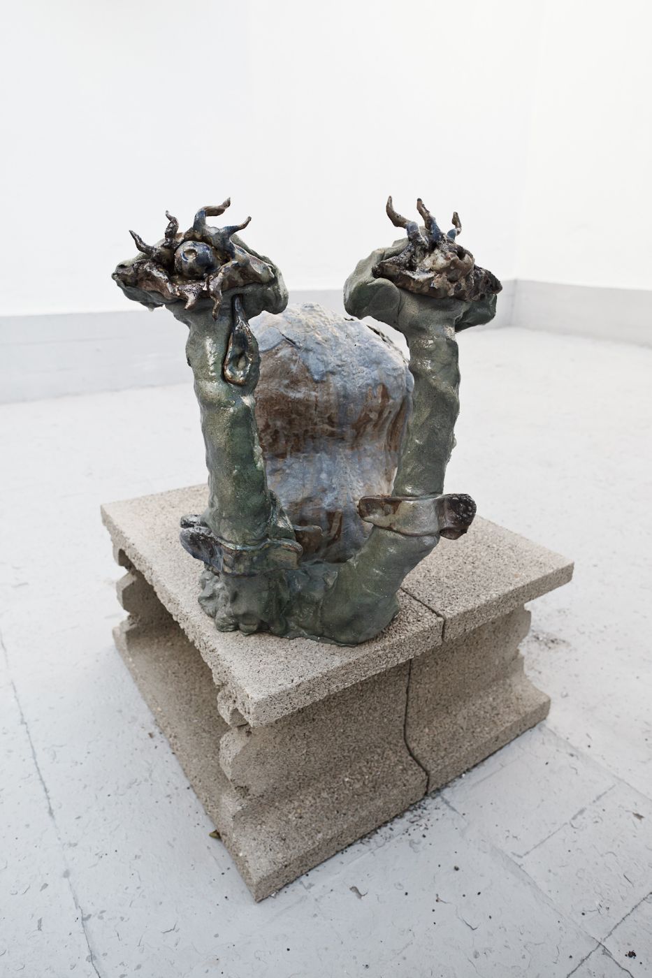 Belgian artist Tom Volkaert (b. 1989) works mainly with clay to create sculptures that combine organic and mineral qualities. He often creates totemic objects that stand like enigmatic signals for deities of lost civilisations, but which at the same time seem to squirm with living tendrils, tissues and teeth.