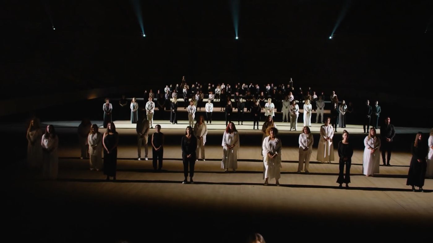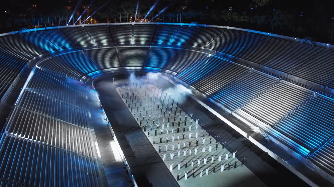 The video opens with the view of the Panathenaic Stadium (also known as Kallimarmaro) from above, resembling an empty stage that will soon come to life with the presence of a choir. A large group of people singing “Let dances carry on” by Greek songwriter Dionysis Savvopoulos is the perfect symbolization of a nation in unity, urging us to tune in with the uplifting, glorious and celebratory theme of the song. The use of the song in this particular occasion marks a conjunction of past and future by surpassing the present moment: a moment of crisis, societal precarity and political turbulence. Everything in the filming of the video corresponds to the idea of a social body performing rigorously but nonetheless spontaneously—especially in close-ups, which show people smiling all the time—so that the whole event is perceived through the lenses of enthusiasm and vitalism, as if the stadium was full with a cheering crowd. This created sense of ‘liveliness’ is both convincing and deceptive (or even convincing because it is deceptive); it stresses that if choreography is an apparatus “distributing the visible and the invisible, generating or eliminating an object, which cannot exist without it” [3], then the choreographic isn’t merely referring to a repertoire of gestures and movements that the people are assigned to perform, but also to a re-distribution of the significations these movements carry, specifically those contributing to the instrumentalization of pluralism, democracy, citizenship.
