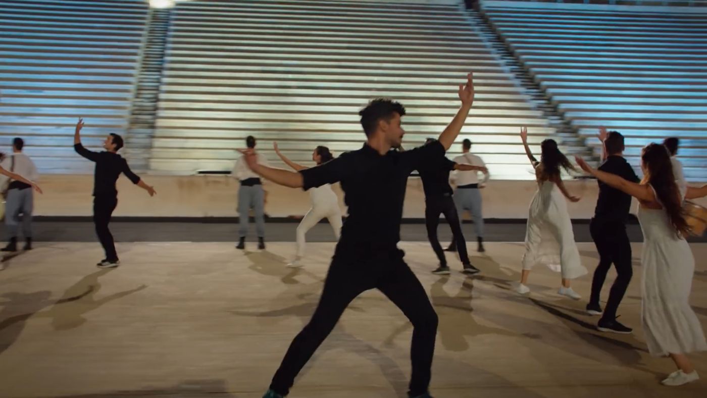 However, if “choreography doesn’t simply inscribe itself in time and space but rather transforms both time and space and bring into existence a ‘world’” [4], then we shouldn’t just (mis)judge the video from the generic choreography it contains or its kitsch aesthetics, but rather focus on how a (refurbished) ancient monument like the Panathenaic Stadium, symbolically laden with the 1890s revival of the Olympics and the agonistic ethic of sports, and a song from the 1980s by Savvopoulos, referring to the unpretentious gatherings of small groups and the untroubled enjoyment of life as typically Greek pride, construct a conception of contemporary Greece which is constantly relived through its glorious past and persistently redirected to an unfulfilled future. The above utopian sketching of a country in stillness between past and future, reinforces what we might call “the historical hegemonic arrest of dance in an aestheticizing image” [5]. This aesthetic burden is typical of the modern dance subject who searches the unique, authentic experience in her body but sooner or later (without realizing it) her body becomes the best workforce prone to exploitation. Thus, if society is somehow depicted in the video, then it is a version of society dancing its ignorance, in the dark we might say; one claiming a revival of the insouciance of the 1980s and the heroic activism of the fighters of the Independence War. The paradox is not a matter of aesthetics per se, but how the above references, by being politically exploited (anticipating maybe a success story just as the Opening and Closing Ceremonies of the Olympic Games in 2004), they adhere to a narrative that contradicts the very essence of independence and freedom—concepts which should remain at the heart of this celebration and ought to be represented differently today.