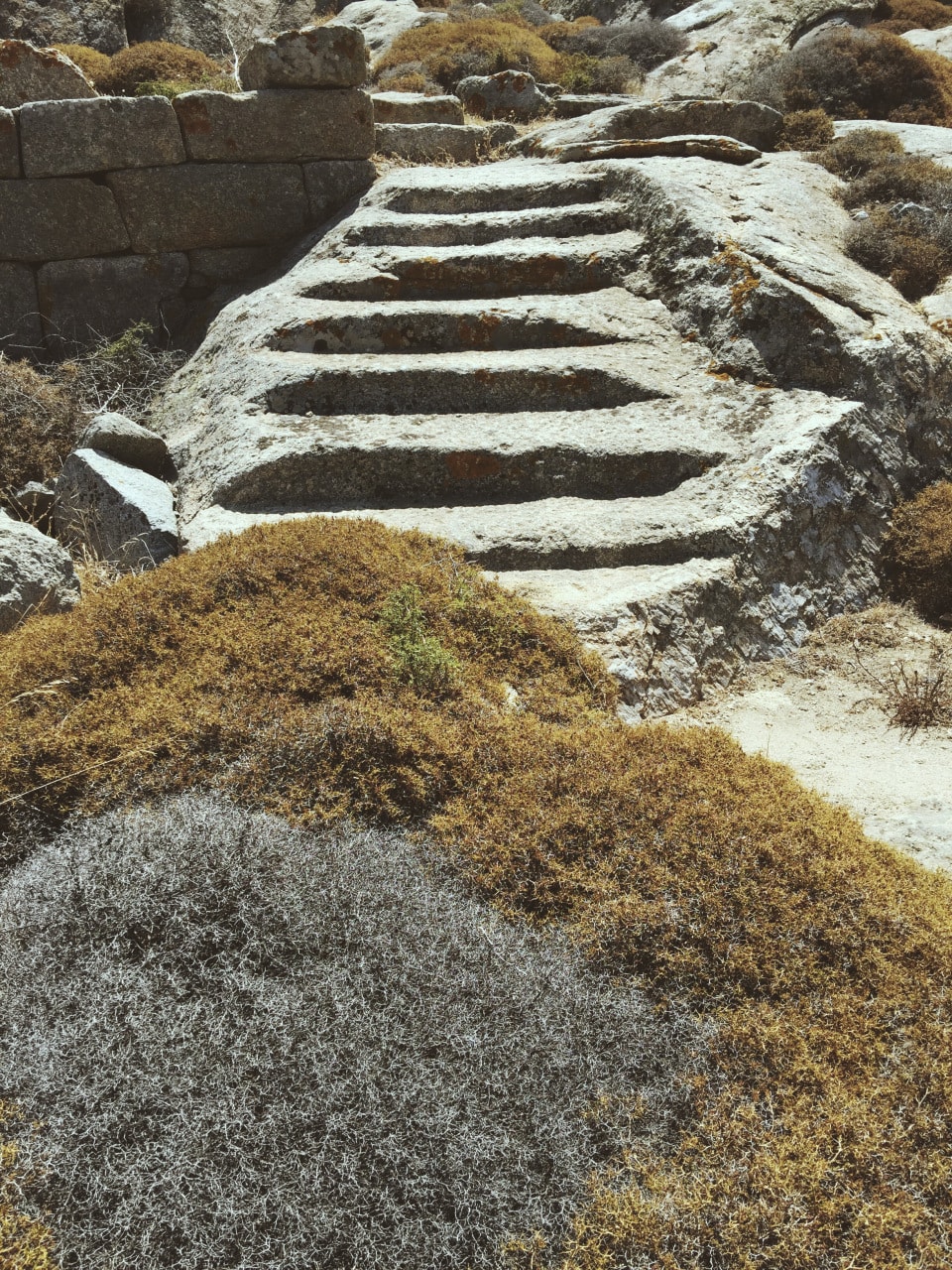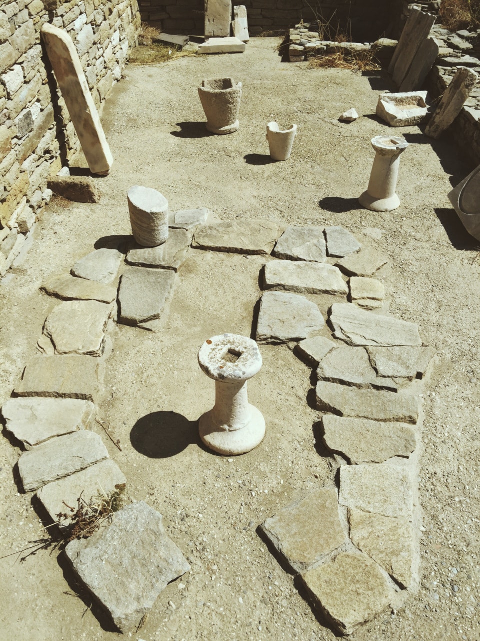 Once a city of 30,000 inhabitants, Delos was considered by the ancients as the birthplace of Apollo and his twin sister, Artemis. Many legends exist as to how Leto, their mother, ended up giving birth there, with my favourite being the one where Zeus, after his love affair with Leto was discovered by his wife Hera, was looking for a safe place for Leto to give birth. There was an island floating around the Aegean, and Zeus ordered it to stop; what a better place to hide your pregnant mistress than an undiscovered island? So this chunk of floating rock came to a standstill next to Mykonos, and turned from ádelon (unknown) to délon (known), providing a nice etymological myth like the ones the Romans seemed to have a taste for. What I love about this story is how a new place came to be in the world not by creation and divine labour (as it’s the case with most stories of how gods make things), but by vocal command and a kind of curation: a rogue island was ordered to stop traveling, and to be turned from a wanderer into a place where one can wander.