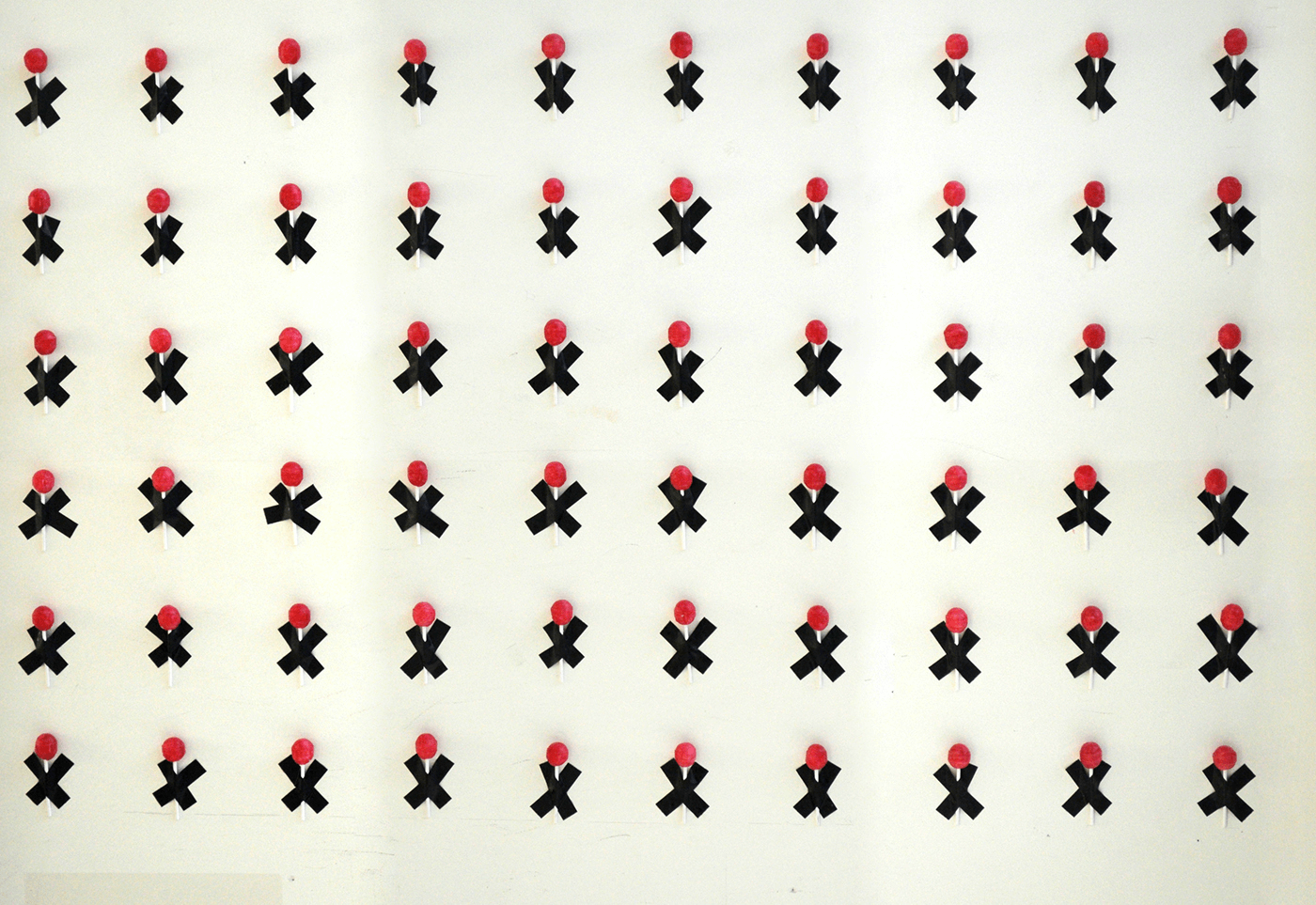 I participated in the exhibition ‘Secrets’ curated by Mr. George Georgakopoulos. The installation “I am unique” referred to human behaviour and how our personality and behaviour is affected especially by art, fashion, music and from pop culture in general. The installation is based on the irony of the human uniqueness in contrast to pop culture. The title “I am unique” comes in contrast with the repetitive scheme of lollipops on the wall. The installation consists of lollipops which are all at the same height, have same color and taste and are made by the same material. The lollipops are placed one next to the other on the wall with black tape creating Xs. The reason I chose lollipops for my installation is because first of all, they are very popular candies and are addressed to children. Children are the first that imitate behaviours in order to be socially accepted. The lollipop as an image belongs to pop culture, which expresses mass-ness and is heavily influenced by mass media. Second, the fact that the lollipop is a candy makes it desirable, and when something is forbidden it becomes more desirable. There is the belief that as human beings we want what we cannot have. The x that is created by the black tape generates this illusion. In addition, the shape of the lollipop with the tape can remind us a very quick drawing of an individual and it consists of three elements which are a vertical line, a circle and an x: | O x