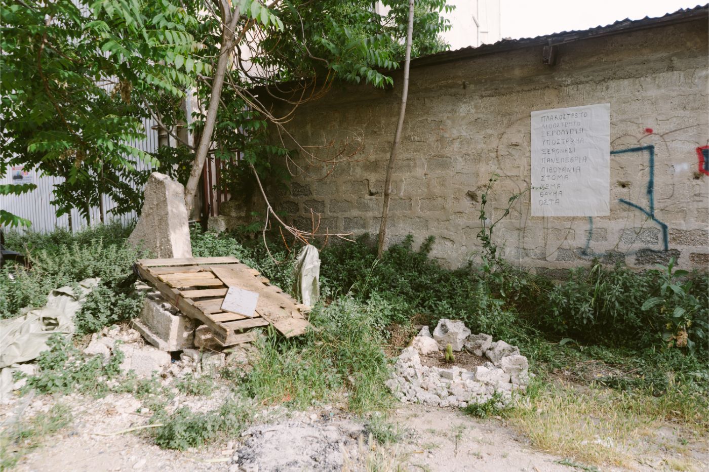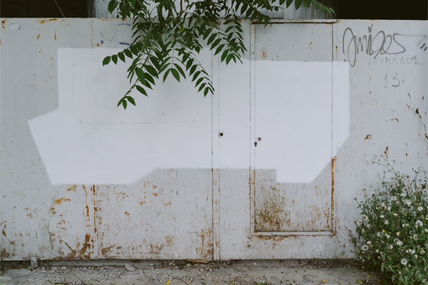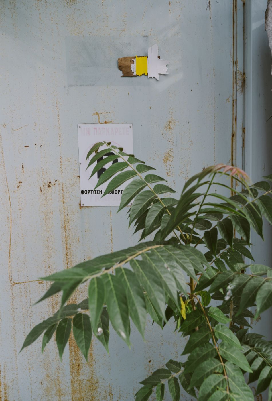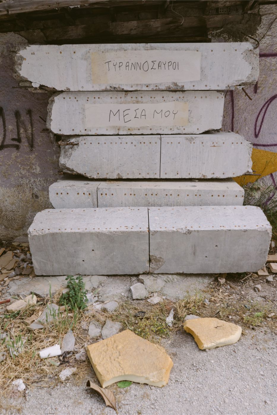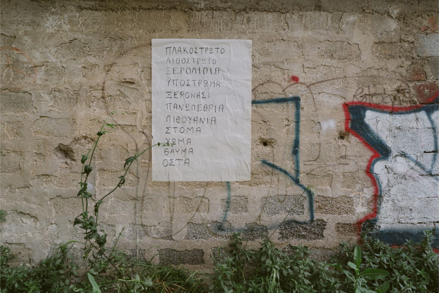 There’s a lot of writing on the walls of Lefkados Street. Being so close to the ASFA means that art students would often use the area for graffiti, murals and experiments. But the whole idea of architectural materials as stationery came to me while walking down Lefkados one day, trying to find my way into the project as a writer. I felt compelled to use any material I could find as a writing surface, to fill objects with words. Gradually, I came to see White Island Good View as a depository of writing, some of which is non-verbal, as Vasilis often works with writing tools to create purely visual work. Brushstrokes, colour blocks, paint-covered salvaged wood, pasted texts — all these relate to affixing writing to a surface. In turn, this treatment of the site led to a reading of it as scripture, drawing attention to all writing found on the street and activating what had already been written there. Two of Vasilis’s graffiti were in fact white patches covering existing tags — again, adding to the idea of reading/writing, only in this case that which was written is now rendered unreadable.
