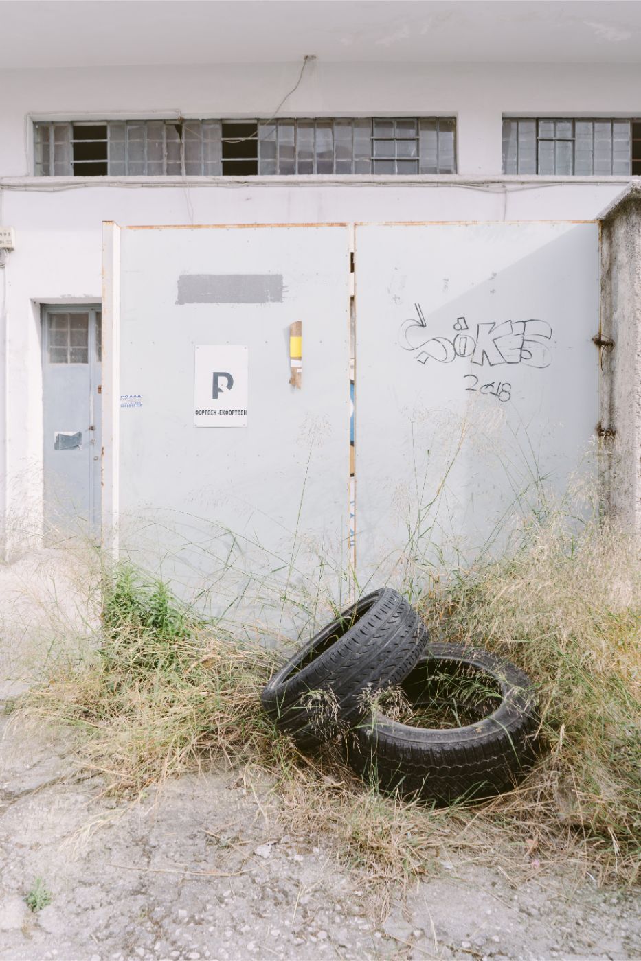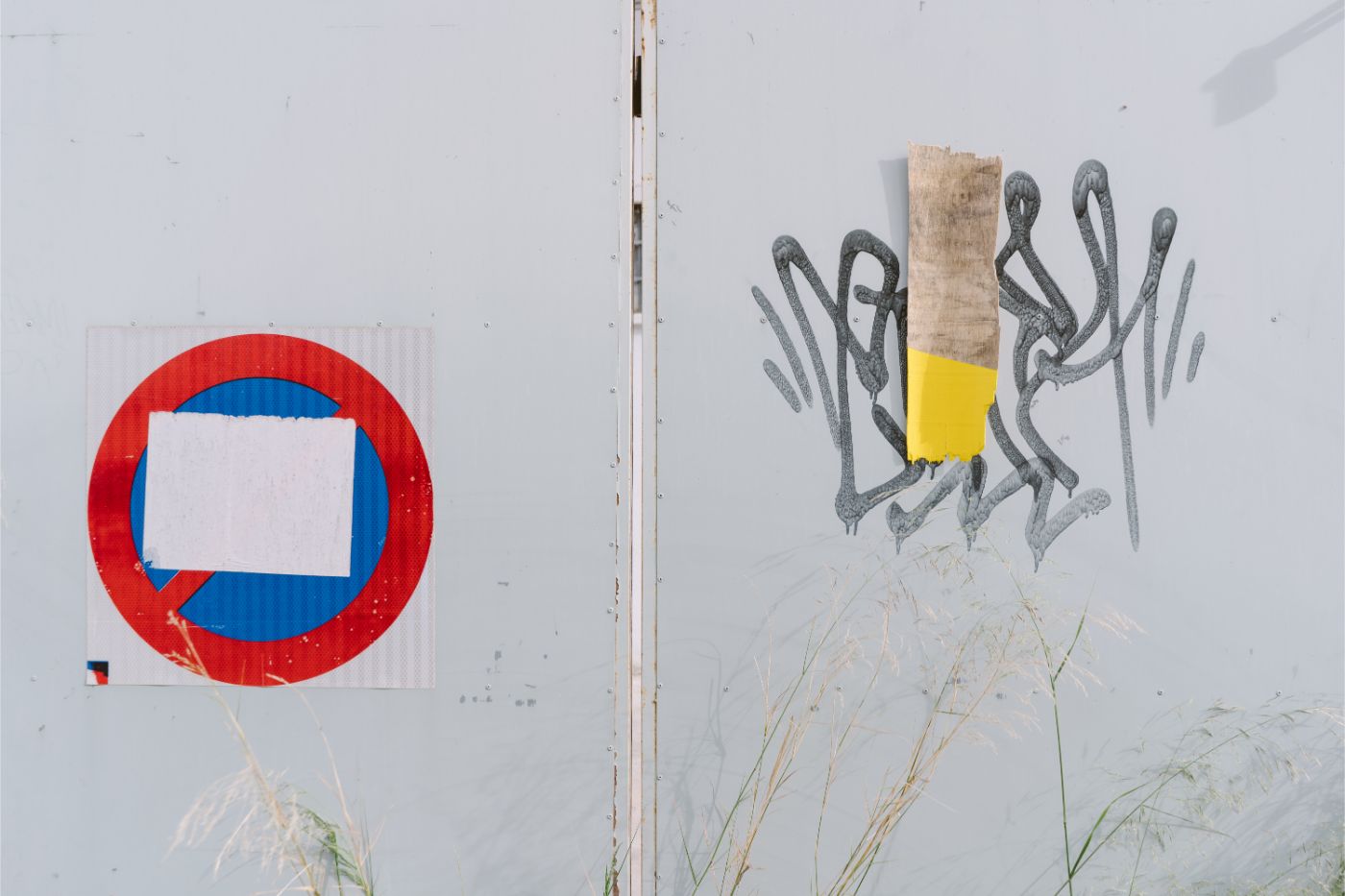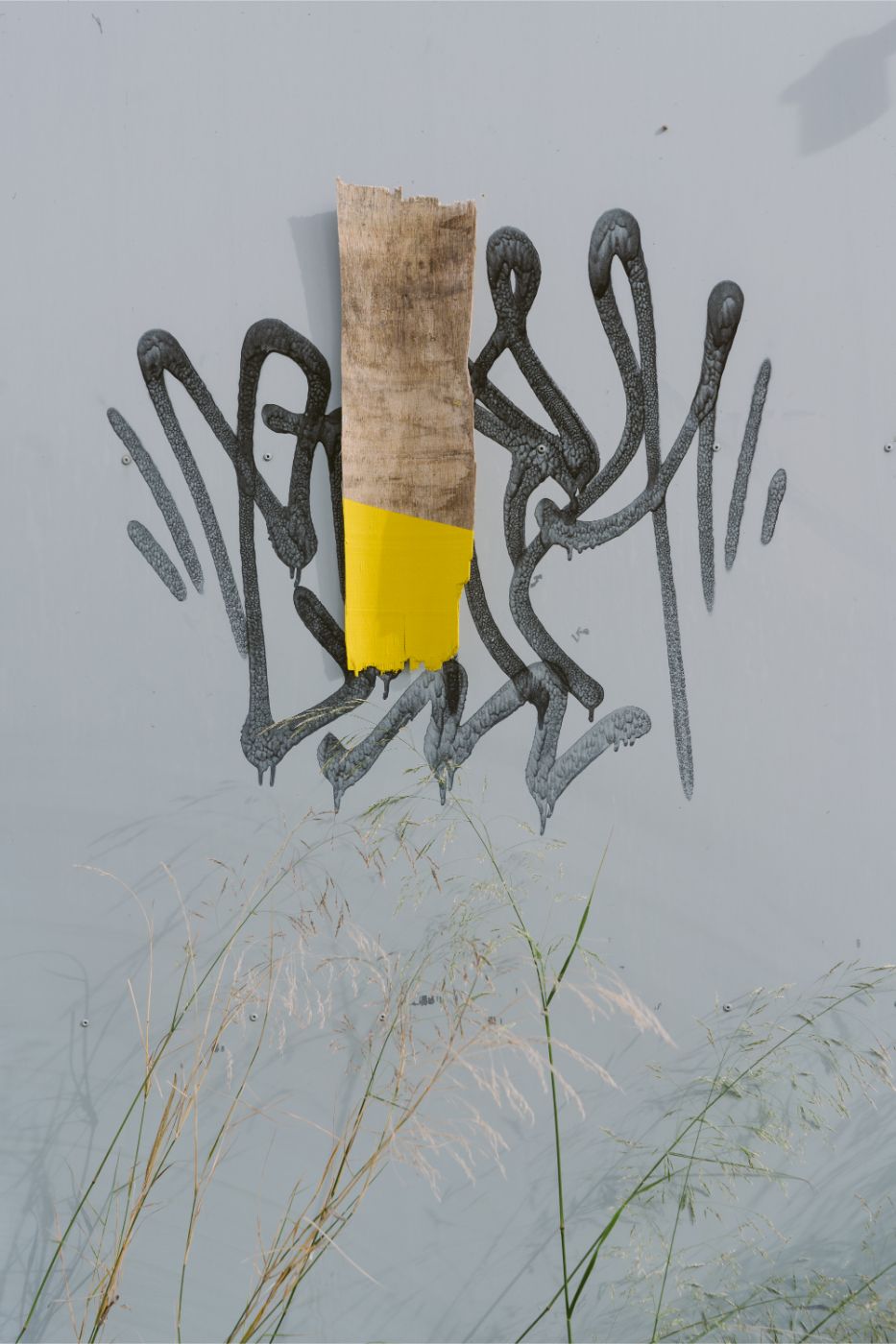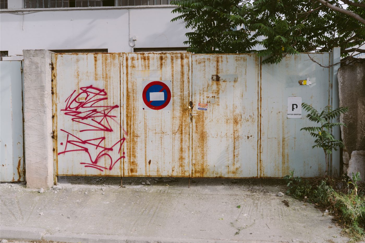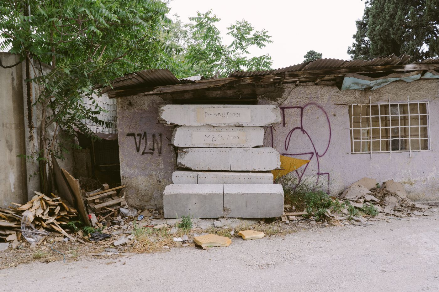 There’s a lot of writing on the walls of Lefkados Street. Being so close to the ASFA means that art students would often use the area for graffiti, murals and experiments. But the whole idea of architectural materials as stationery came to me while walking down Lefkados one day, trying to find my way into the project as a writer. I felt compelled to use any material I could find as a writing surface, to fill objects with words. Gradually, I came to see White Island Good View as a depository of writing, some of which is non-verbal, as Vasilis often works with writing tools to create purely visual work. Brushstrokes, colour blocks, paint-covered salvaged wood, pasted texts — all these relate to affixing writing to a surface. In turn, this treatment of the site led to a reading of it as scripture, drawing attention to all writing found on the street and activating what had already been written there. Two of Vasilis’s graffiti were in fact white patches covering existing tags — again, adding to the idea of reading/writing, only in this case that which was written is now rendered unreadable.