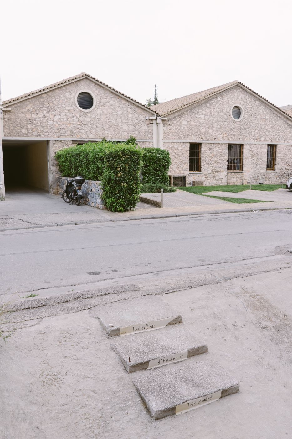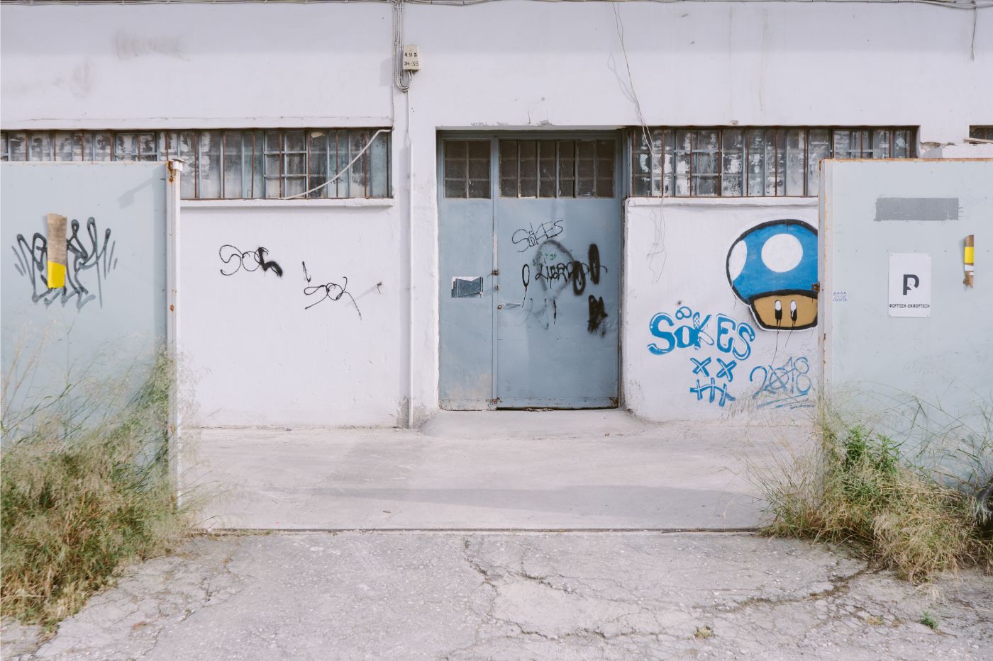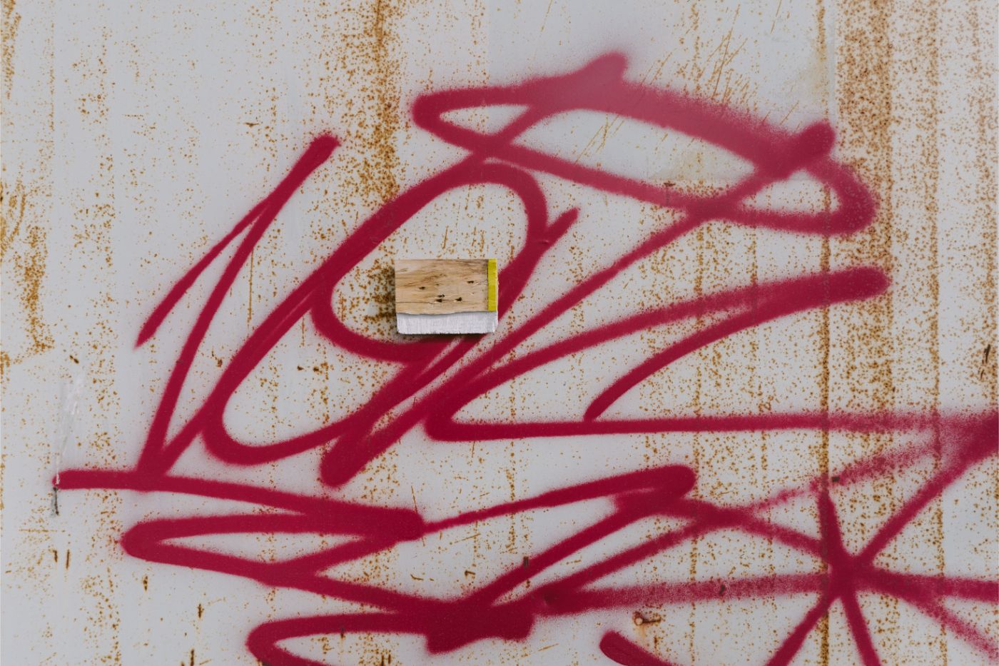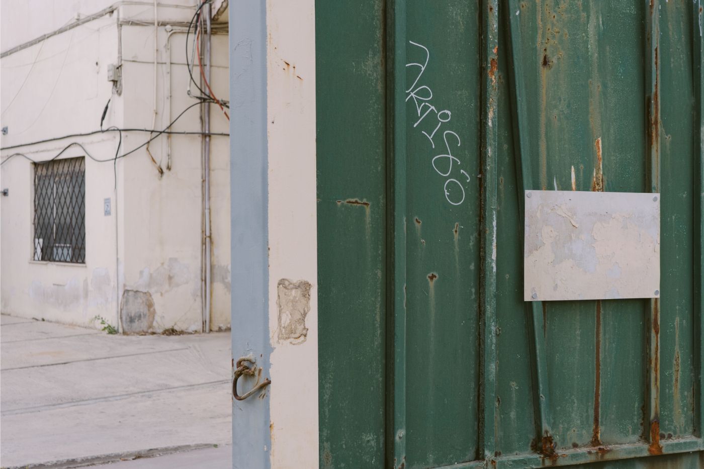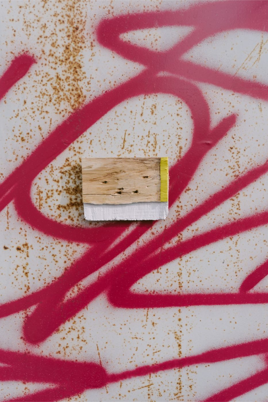 There’s a lot of writing on the walls of Lefkados Street. Being so close to the ASFA means that art students would often use the area for graffiti, murals and experiments. But the whole idea of architectural materials as stationery came to me while walking down Lefkados one day, trying to find my way into the project as a writer. I felt compelled to use any material I could find as a writing surface, to fill objects with words. Gradually, I came to see White Island Good View as a depository of writing, some of which is non-verbal, as Vasilis often works with writing tools to create purely visual work. Brushstrokes, colour blocks, paint-covered salvaged wood, pasted texts — all these relate to affixing writing to a surface. In turn, this treatment of the site led to a reading of it as scripture, drawing attention to all writing found on the street and activating what had already been written there. Two of Vasilis’s graffiti were in fact white patches covering existing tags — again, adding to the idea of reading/writing, only in this case that which was written is now rendered unreadable.