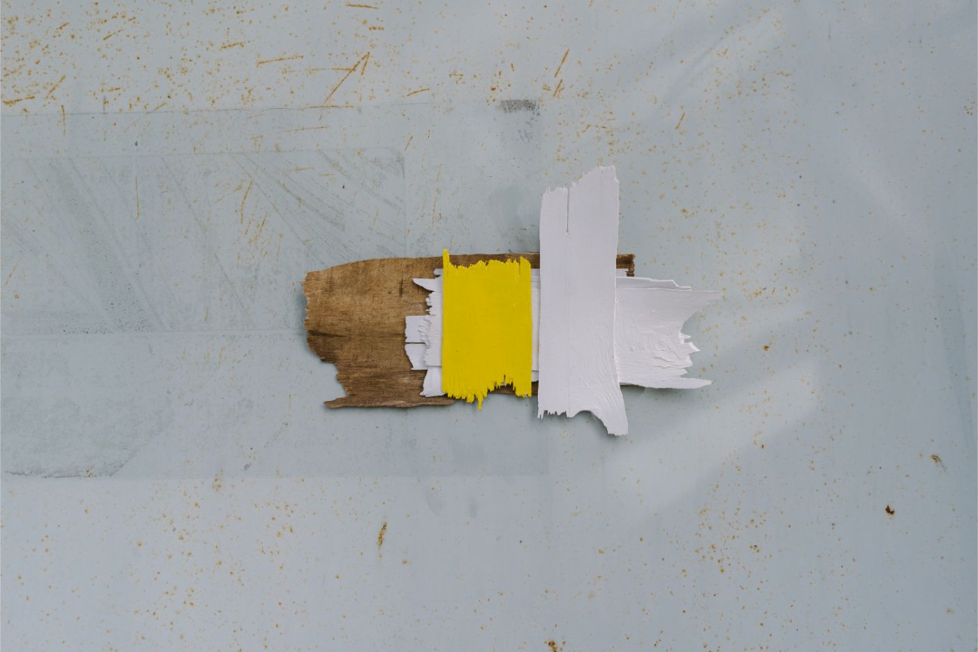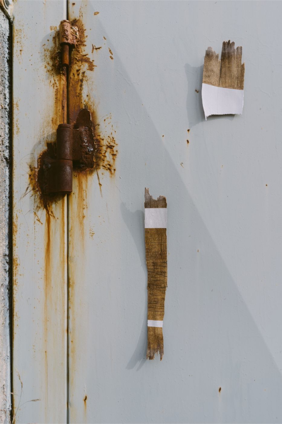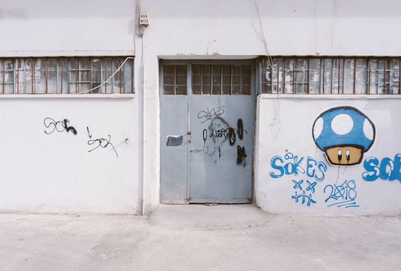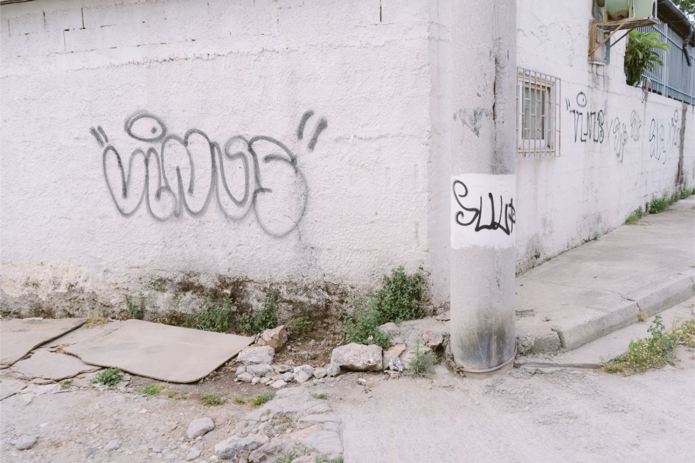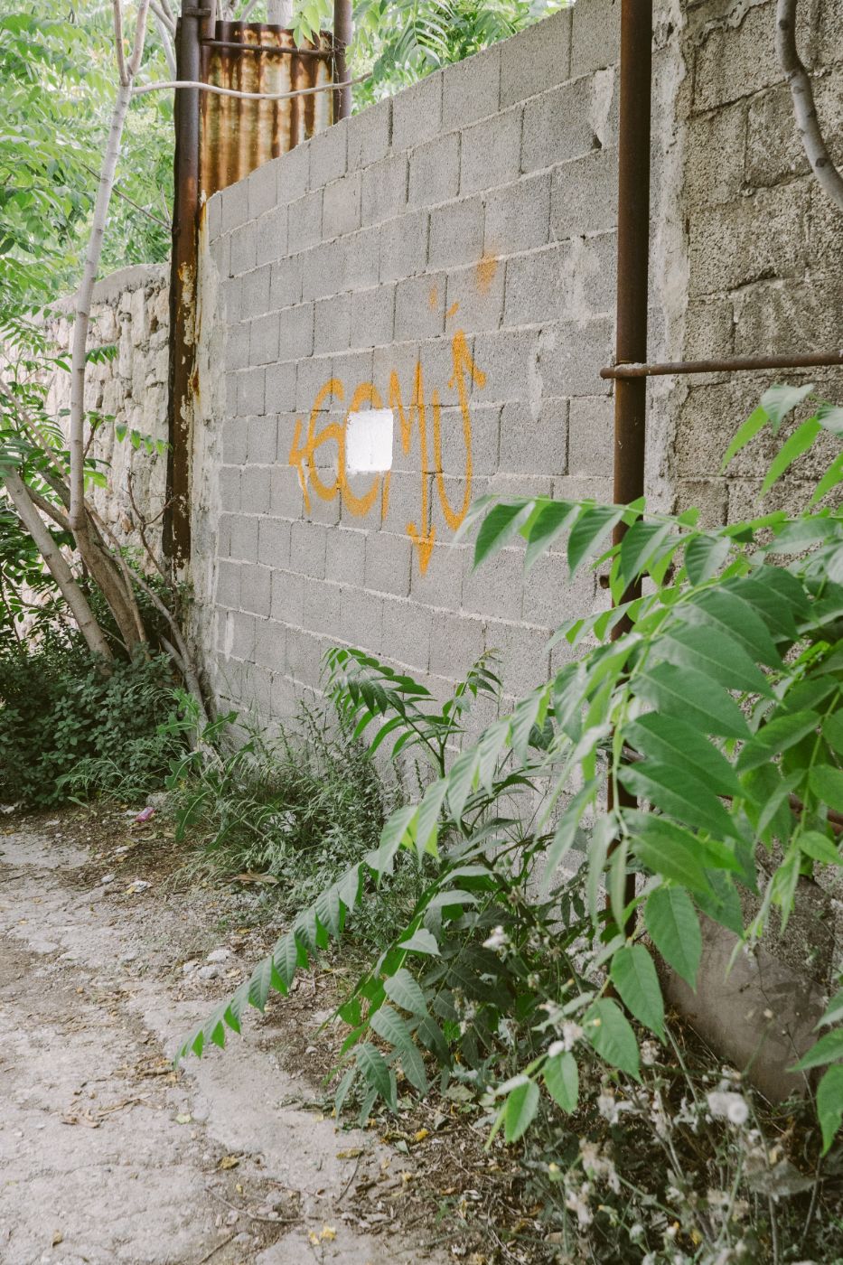 There’s a lot of writing on the walls of Lefkados Street. Being so close to the ASFA means that art students would often use the area for graffiti, murals and experiments. But the whole idea of architectural materials as stationery came to me while walking down Lefkados one day, trying to find my way into the project as a writer. I felt compelled to use any material I could find as a writing surface, to fill objects with words. Gradually, I came to see White Island Good View as a depository of writing, some of which is non-verbal, as Vasilis often works with writing tools to create purely visual work. Brushstrokes, colour blocks, paint-covered salvaged wood, pasted texts — all these relate to affixing writing to a surface. In turn, this treatment of the site led to a reading of it as scripture, drawing attention to all writing found on the street and activating what had already been written there. Two of Vasilis’s graffiti were in fact white patches covering existing tags — again, adding to the idea of reading/writing, only in this case that which was written is now rendered unreadable.