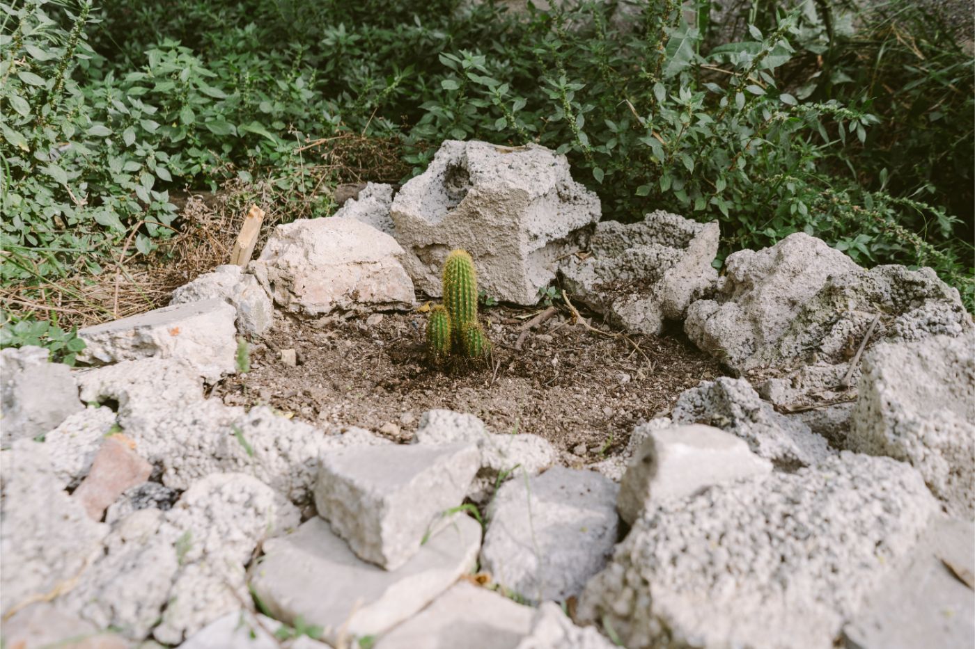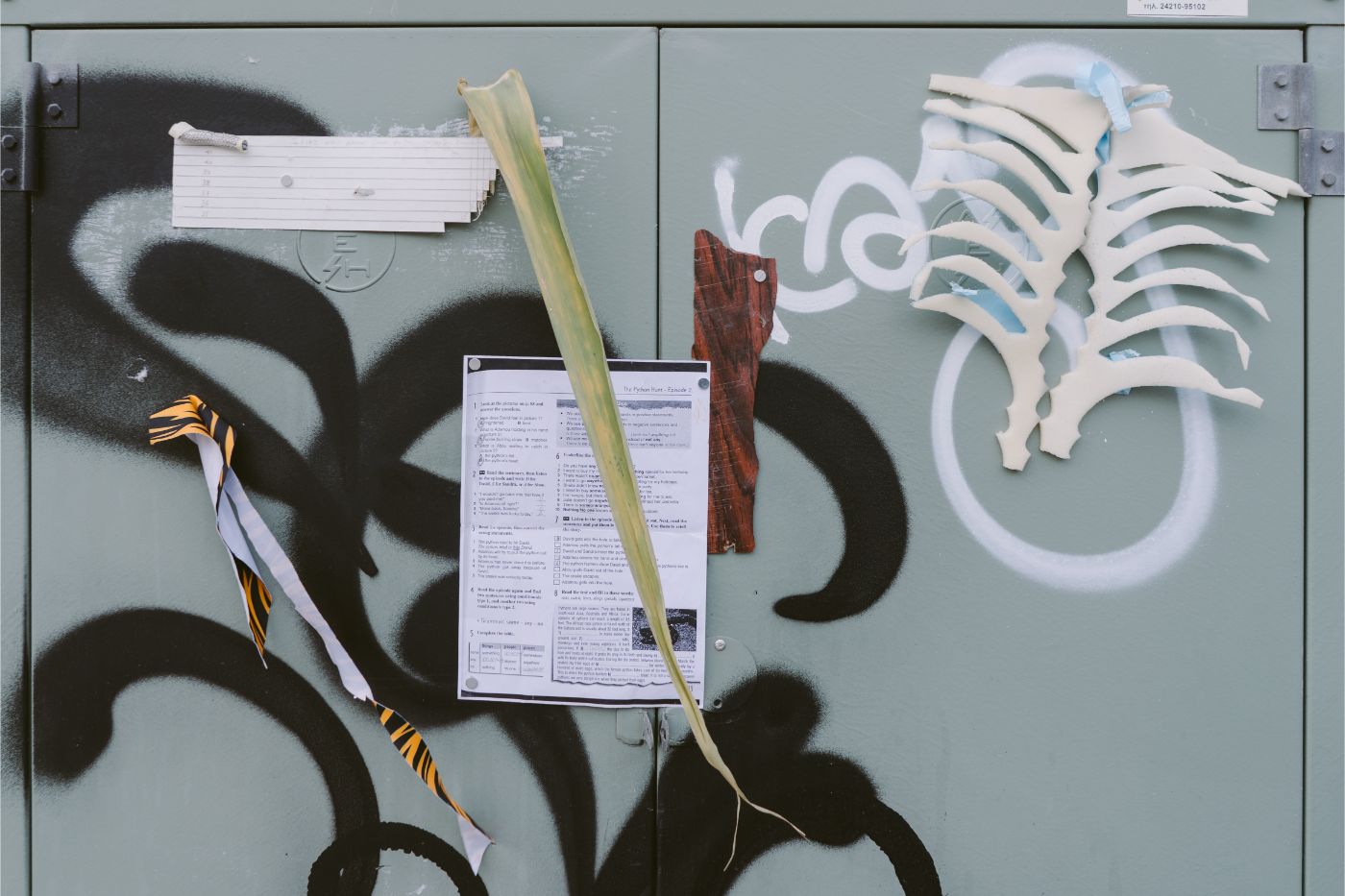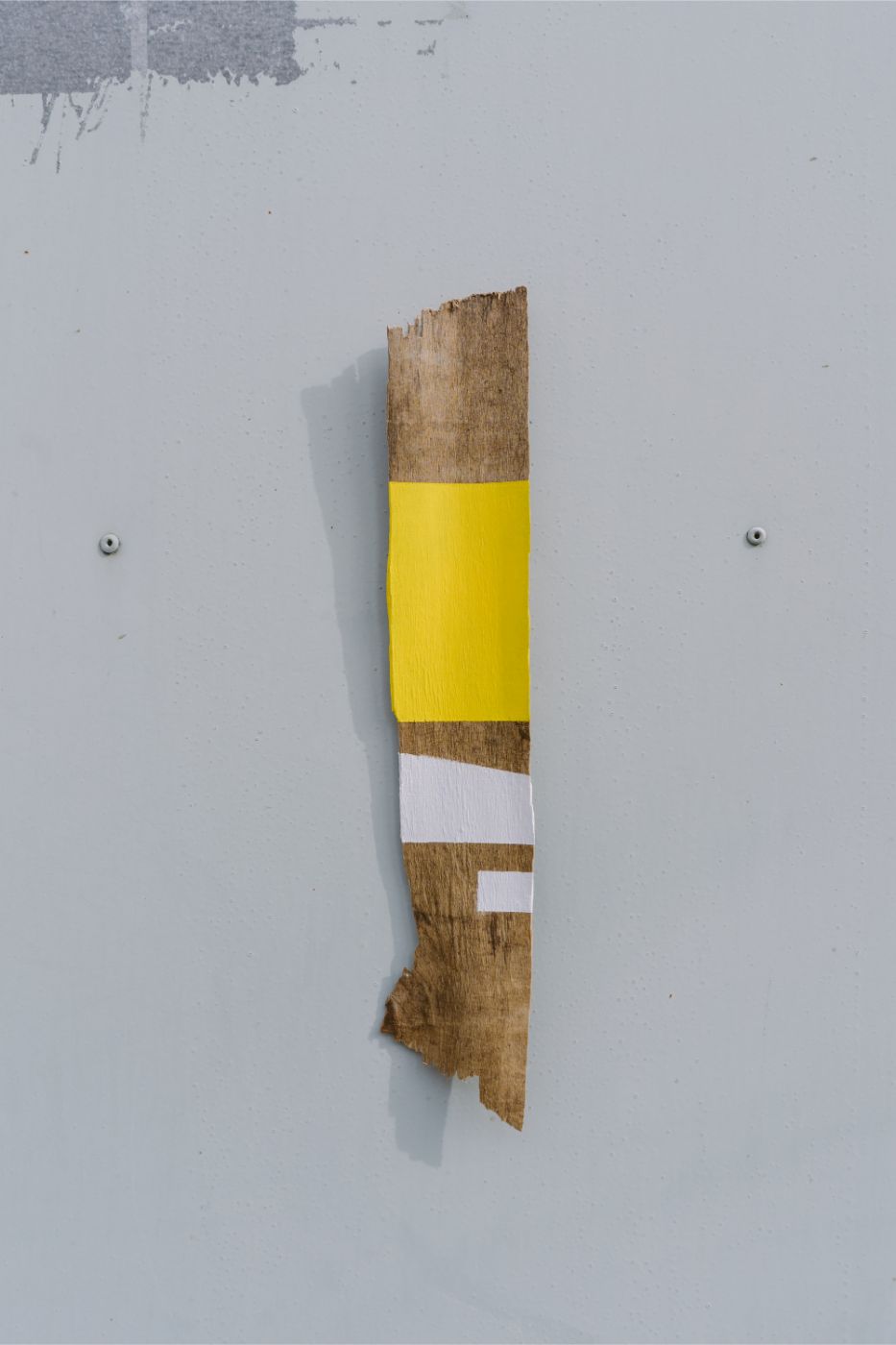 A site-specific project can create a connection with its location in many ways. We decided to set the rule that the materials used would be that connection. The works created for the exhibition used materials found only on Lefkados Street, and as such they defined the final result. We collected a lot of scrap paper from the local recyclers, pieces of scrap plastic, fabrics, wooden pieces, leaves, rocks and many other objects that we took away to our studios to process and work with. Vasilis decided to paint some of these objects over. I mostly used them for collages and as writing surfaces. Stavros Rossos, our graphic designer, also followed the same rule, and used objects from the street to create the visuals for the White Island Good View pamphlet. As such, all the works seem to grow out of their environment. The fact that they sometimes seem transparent or camouflaged is a matter of seeing and not of their making: just as colonialists see indigenous people as part of the landscape, so do we see the objects that belong in their context as homogenous, flat.