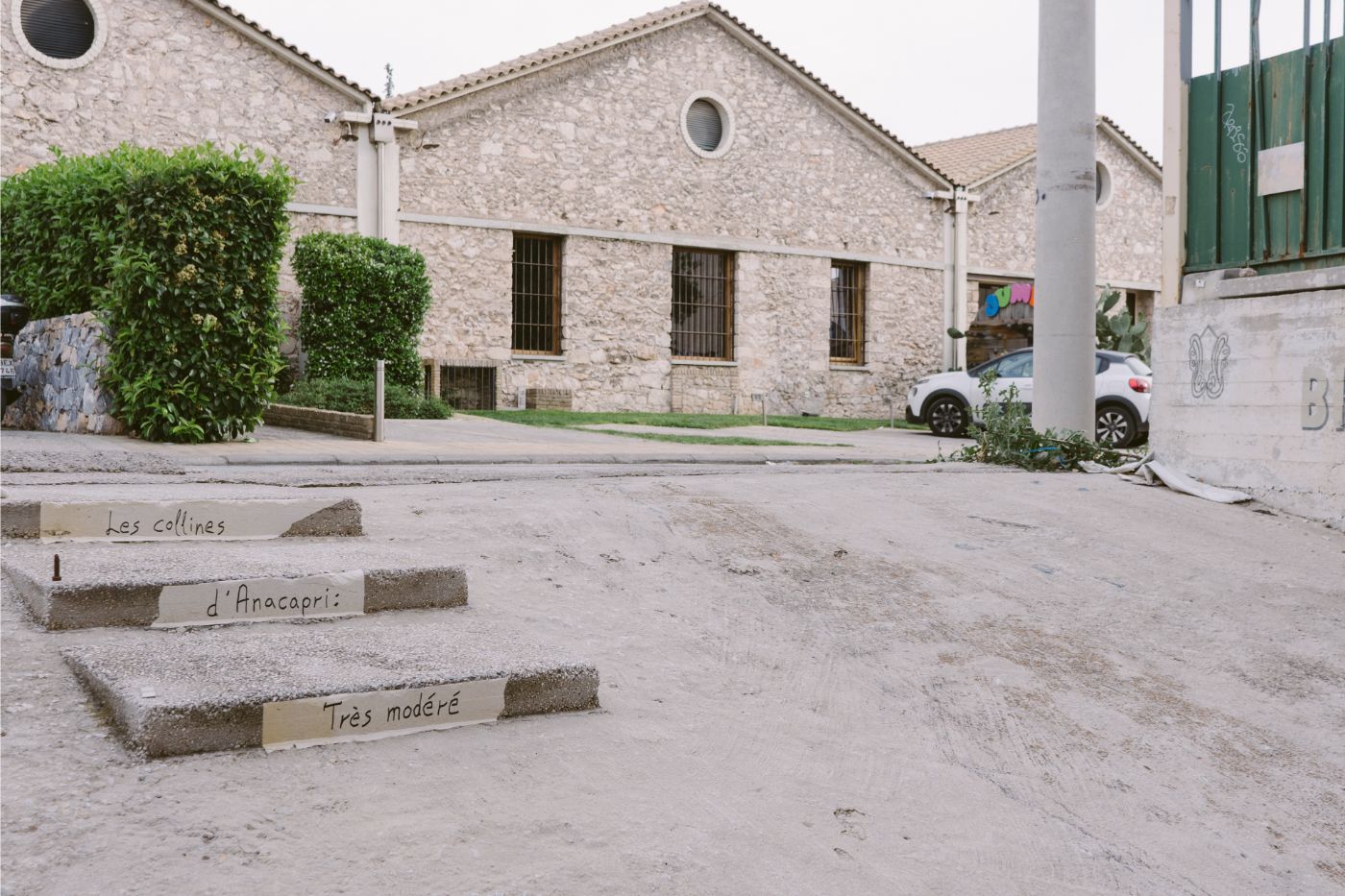 It was essential to keep the exhibition open in terms of how it can be read and accessed. Lefkados Street has many entry points, and the fact that it cuts across all streets leading from the Kallithea train station to Athens School of Fine Arts means that the exhibition flow would always intersect the flow of people moving between the two points. Visitors come and go, back and forth, just as trains come and go at the nearby station. In our invitation we encouraged visitors to experience White Island Good View as a palindrome, which means to see the whole exhibition, then walk all the way back to where they started. This double take, a reverse repetition, creates new readings and triggers new connections. It also encourages visitors to turn the exhibition on its head, or simply wander off on their way back to make their own observations.