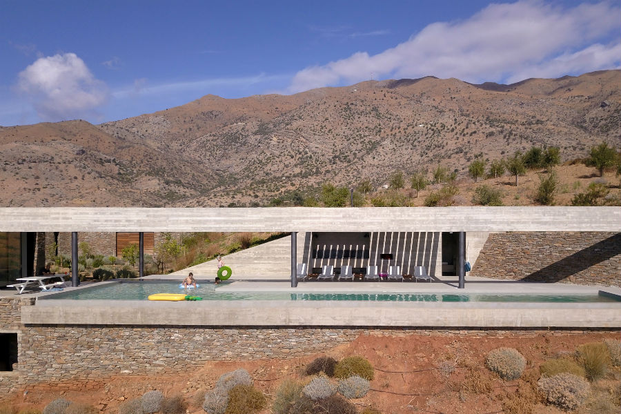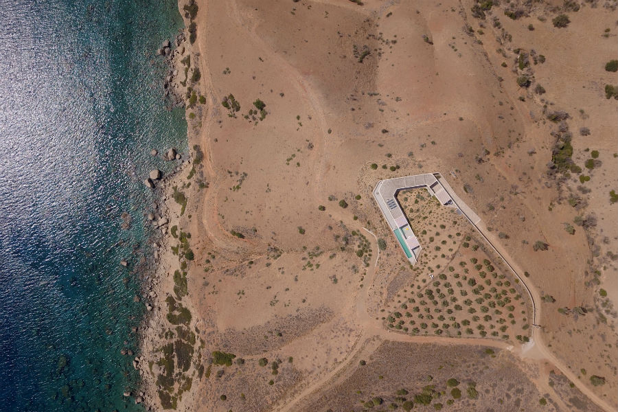 Ring House lies on the south coast of Crete, just 165 nautical miles from the Sahara Desert. Two beams of visible concrete create a ring that traces the morphology of the ground atop a hill. The ring creates shaded zones, ventilated spaces that are open on both sides, and surfaces for solar panels. It also shelters an interior garden with a variety of citrus trees and herbs. The design of the residence and its immediate surroundings creates a microclimate, an oasis within an intensely beautiful yet bodily demanding landscape. On a larger scale, Ring House’s design is an attempt to restore the natural landscape, which has been scarred by random and unplanned roads.