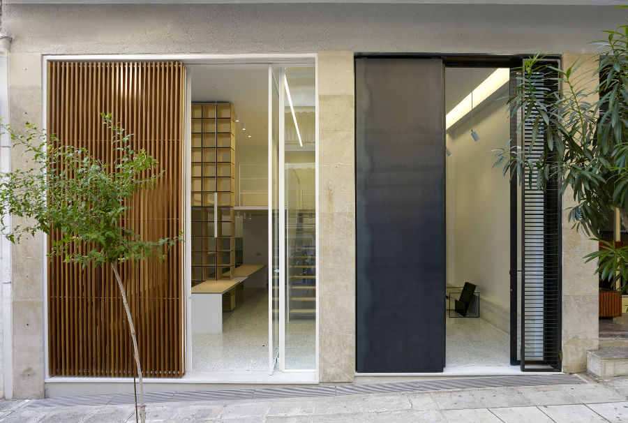 Two abating but independent street-level shops of an old Athenian polykatoikia (apartment building) in Pagkrati become the frame of this architectural intervention that has transformed them into a solicitor’s office and an artist’s studio respectively. The main element of this double intervention is the creation of two self-standing, small-scale modular structures that are independent from the existing building, both inside the shell and on the side facing the street. The aim of this choice is to redefine how a street-level space within a dense urban landscape can be inhabited, through highlighting the relationship between what was added and what was already there.