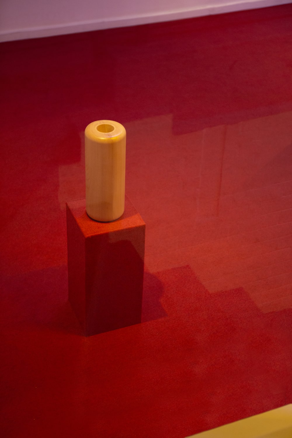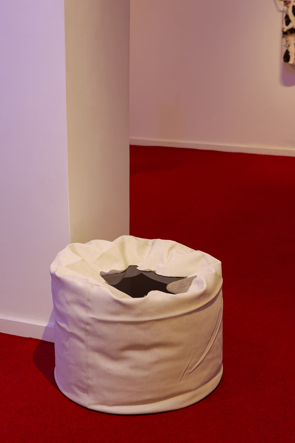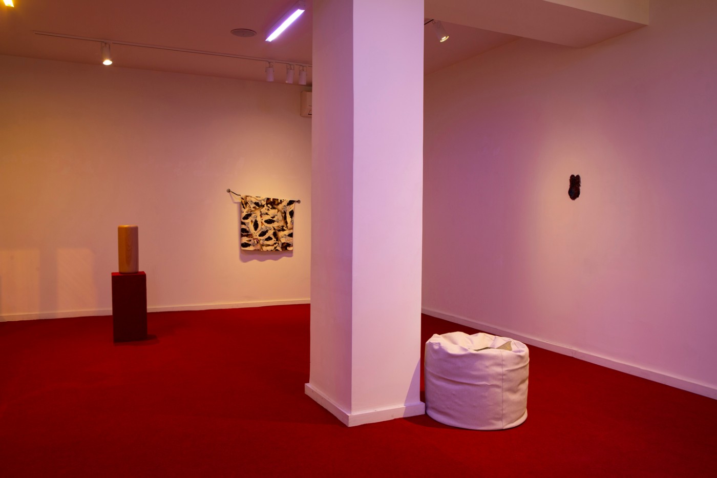 For his new solo show at Nitra Gallery Athens, Antwerp-based visual artist Yorgos Maraziotis transforms the entire gallery space into an immersive installation that lures visitors in with softness warmth. The entire space is covered with thick red carpet that muffles sound and creates a sense of domesticity, only reinforced by the suppleness of the fabric used in two of the main artworks, as well as a well-polished wooden cylinder with round edges standing illuminated on a pedestal. The entire installation is dimly lit by a dim, otherworldly light which is the result of a combination of yellow and purple fluorescent lamps installed on the ceiling.