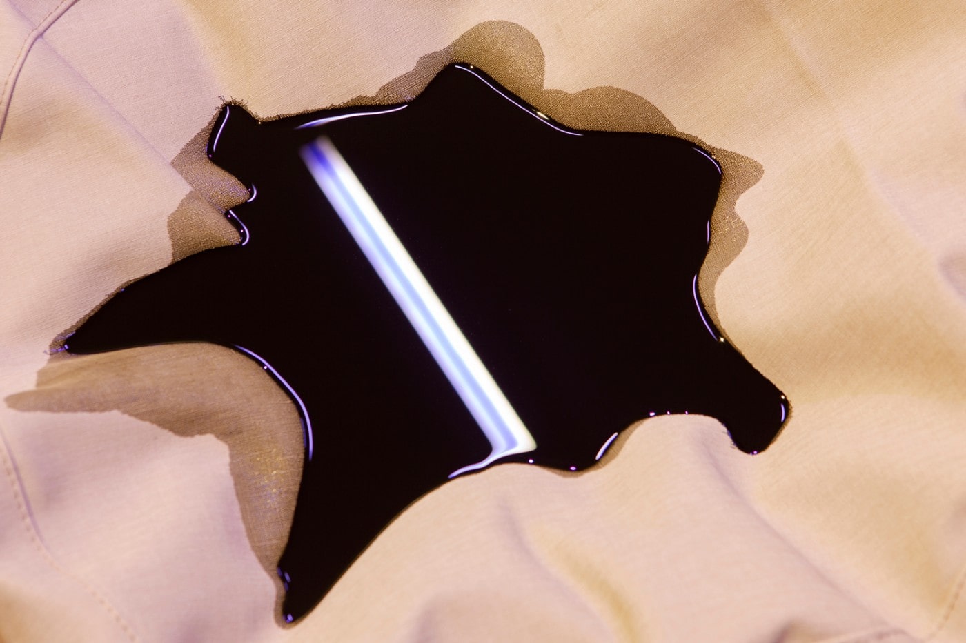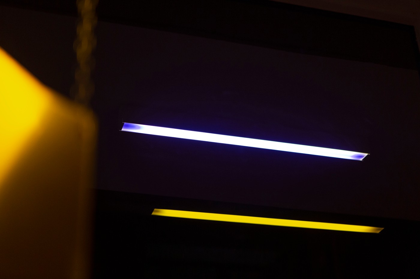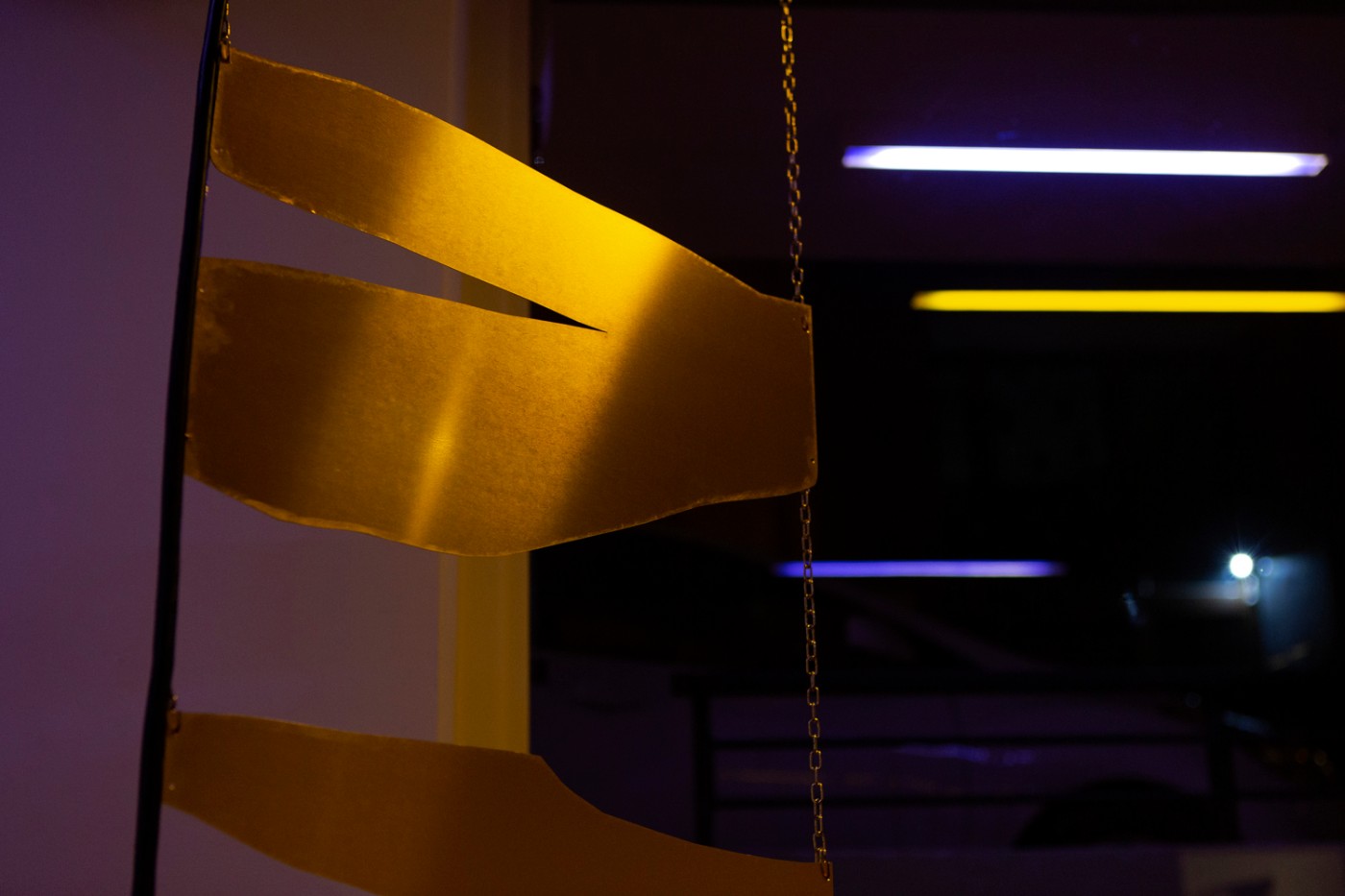 For his new solo show at Nitra Gallery Athens, Antwerp-based visual artist Yorgos Maraziotis transforms the entire gallery space into an immersive installation that lures visitors in with softness warmth. The entire space is covered with thick red carpet that muffles sound and creates a sense of domesticity, only reinforced by the suppleness of the fabric used in two of the main artworks, as well as a well-polished wooden cylinder with round edges standing illuminated on a pedestal. The entire installation is dimly lit by a dim, otherworldly light which is the result of a combination of yellow and purple fluorescent lamps installed on the ceiling.