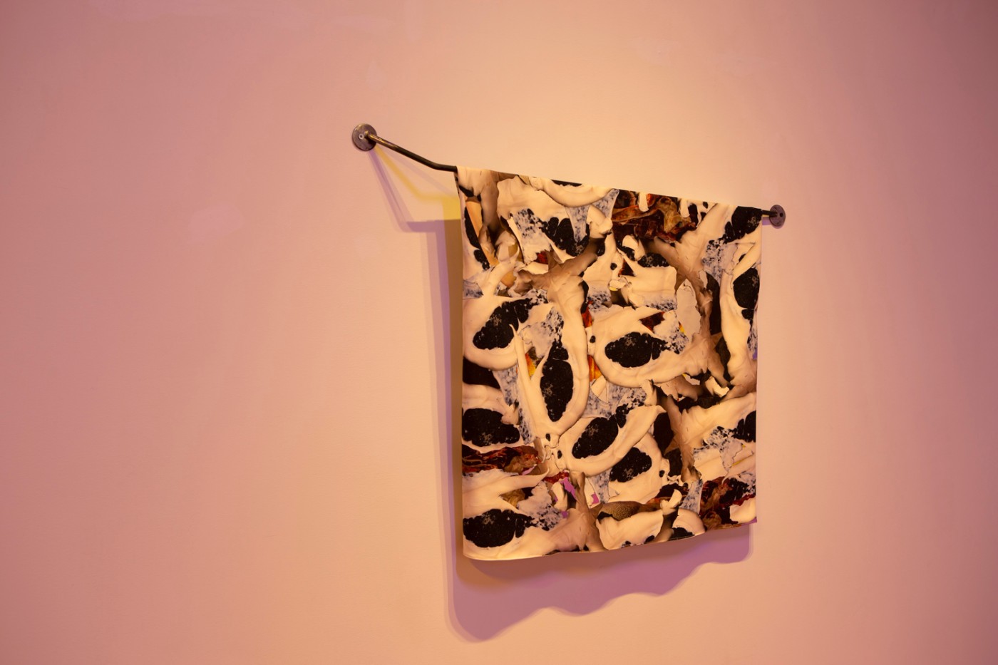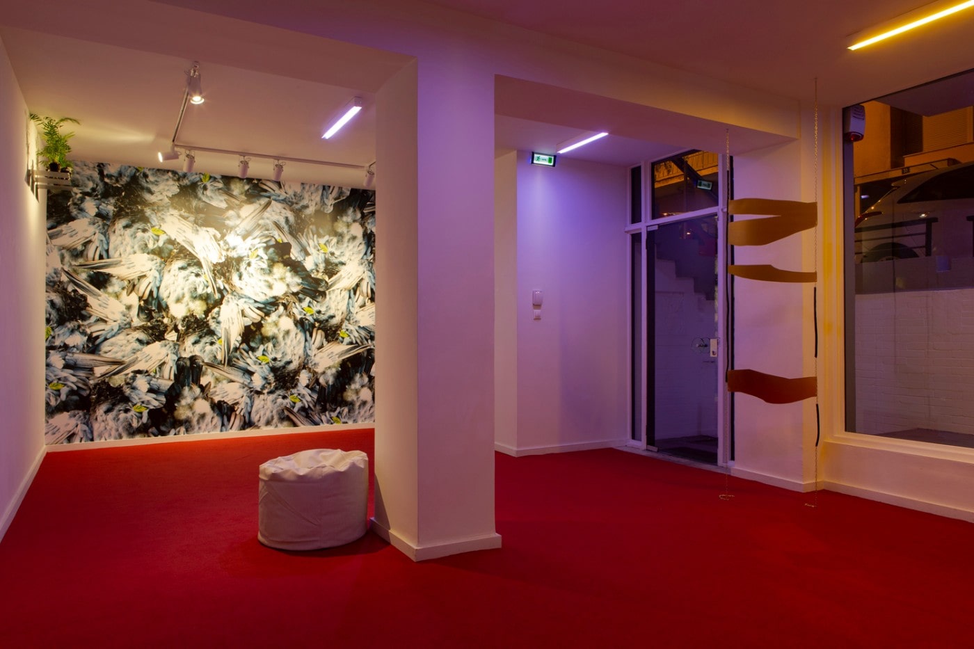 The installation indeed welcomes guests with materials that invite the touch and create a sense of containing safety and relaxation. As soon as visitors set foot on the lush red carpet, they are drawn to the far right wall by a digital print covering its entire surface. It depicts a random photographic pattern of a fluffy, feather-like texture tinted with with blue and some scattered green leaves. Upon closer inspection however, and only after the visitor has been drawn already close to the image, does it become apparent that the fluffy texture is in fact the exposed belly of a dead bird photographed from above. The work is a collage of a photo of the dead animal taken by the artist on a walk. It is from here that the whole experience of the installation takes a completely different turn, exposing its apparent coziness as tainted by the macabre and the untouchable.