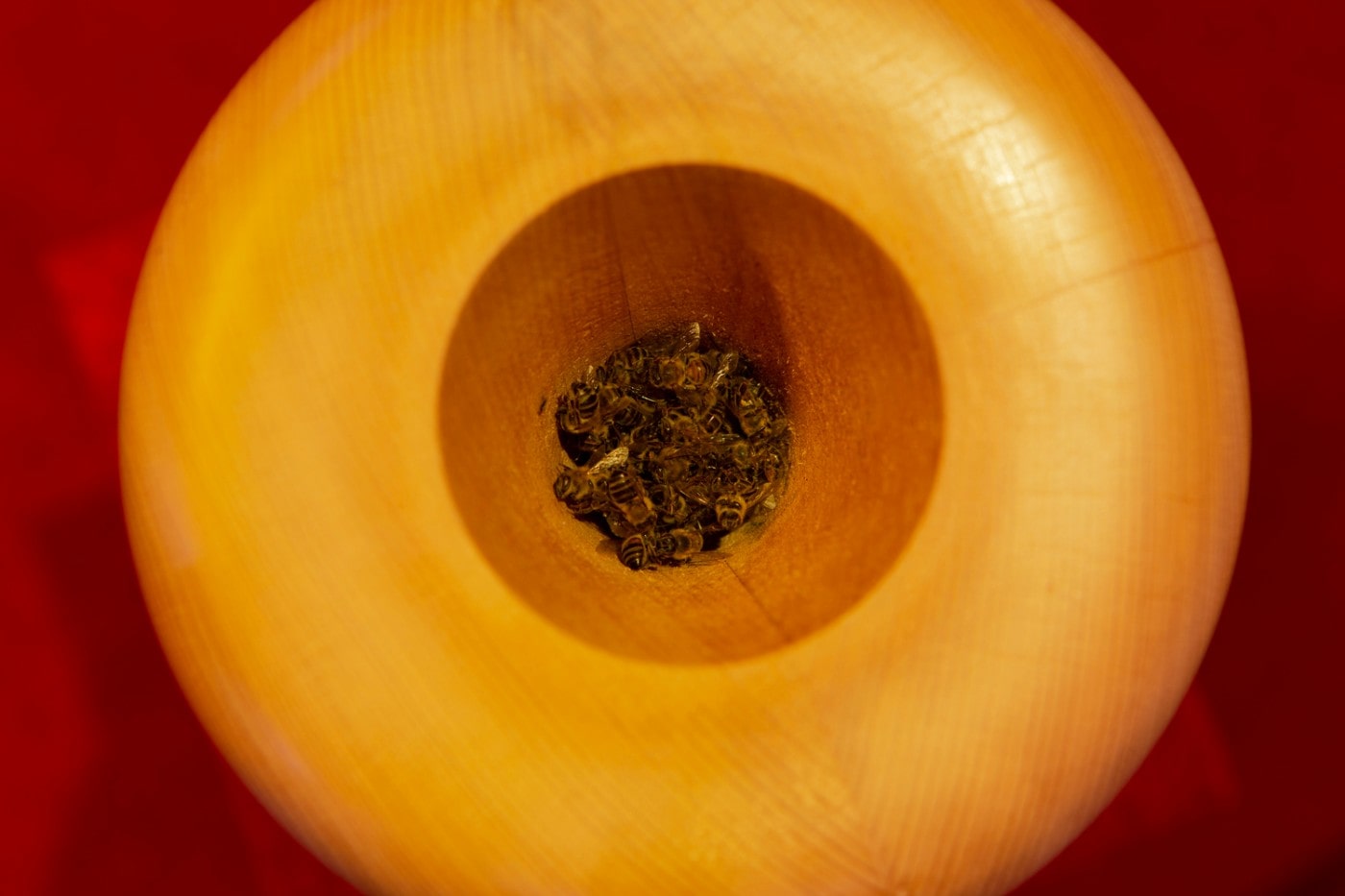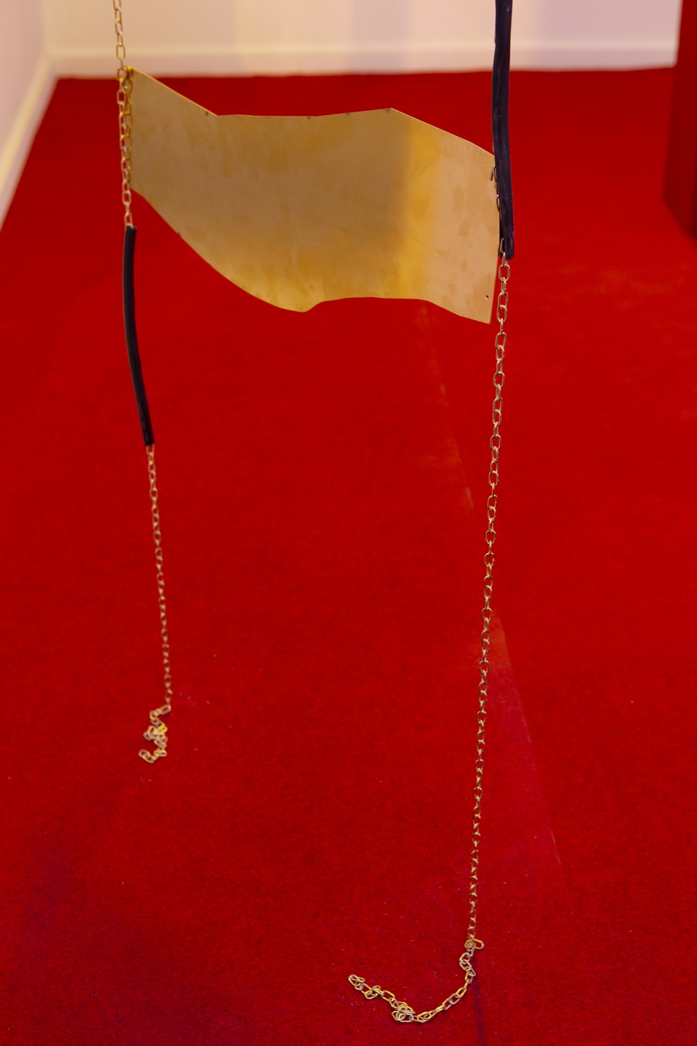 As one wanders deeper into the installation is confronted by similar startling revelations: a beige fabric pouf has a puddle of burnt machine oil pressing it down, and the wooden buffed cylinder that begs to be touched is in fact filled with dead bees. Over time, the regal red carpet takes more the colour of blood, and the beautiful bronze mirrors hanging elegantly from the ceiling feel fractured and razor sharp. The nuances of each object, its materiality and the way it interacts with the special lighting are impossible to capture with a camera, and can only be experienced fully in person.